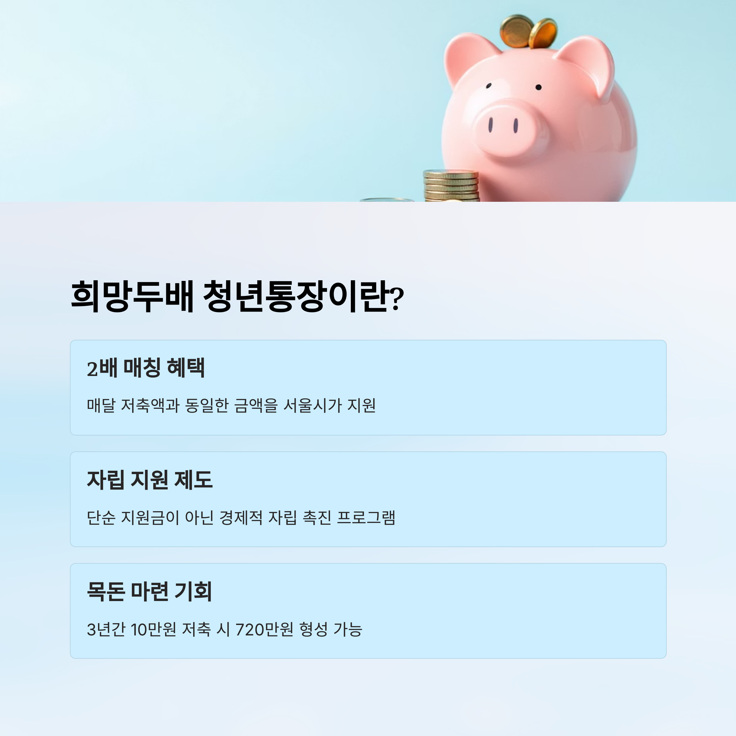‘희망두배 청년통장’은 서울시에 거주하는 근로 청년을 대상으로 자산 형성과 자립을 돕기 위한 지원 제도예요. 참여자가 매달 일정 금액을 저축하면, 서울시가 같은 금액을 매칭해서 2배로 돌려주는 구조죠. 예를 들어 매달 10만 원을 3년간 저축하면, 총 720만 원에 달하는 목돈을 만들 수 있어요.