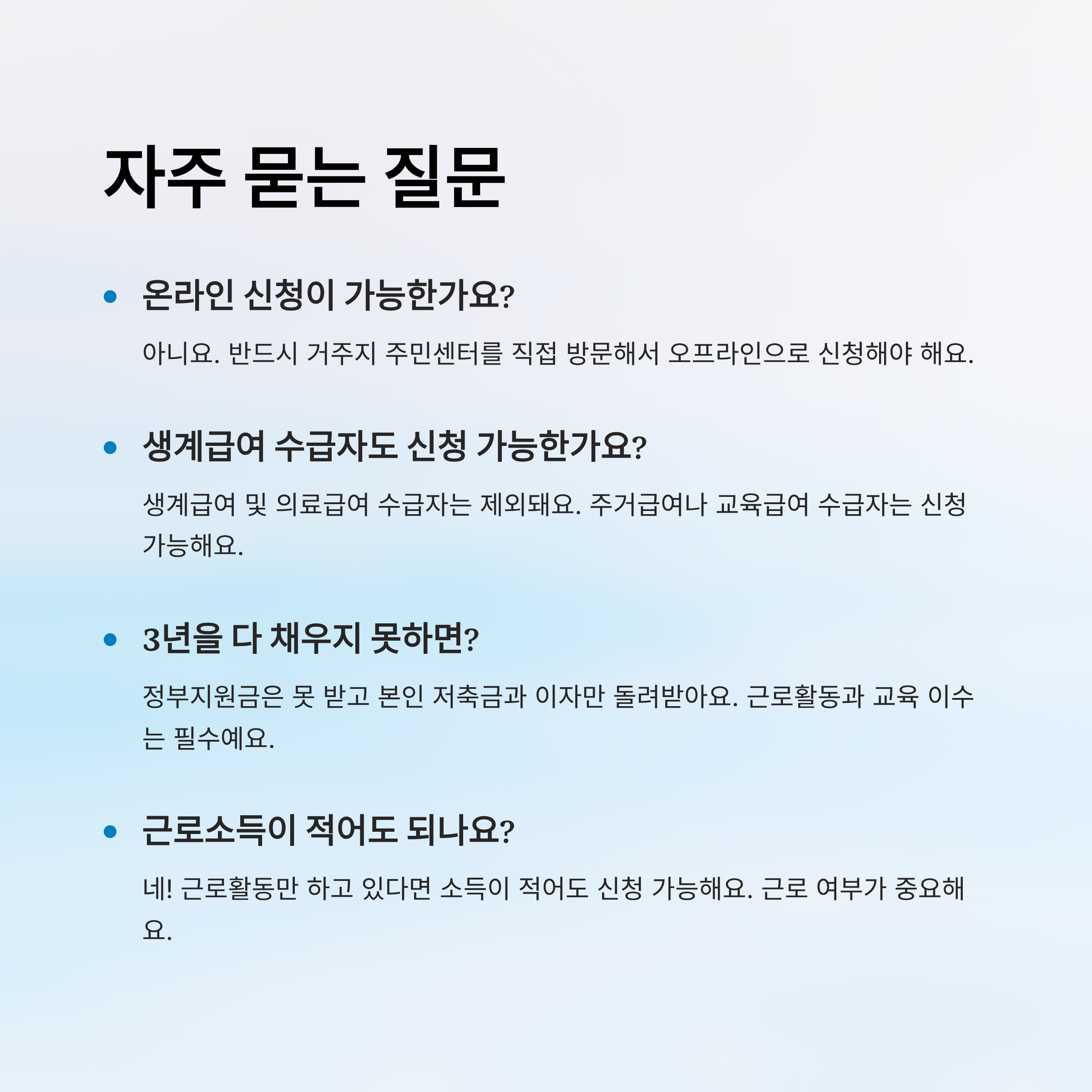 “일용직이라 처음엔 내가 대상이 될까 걱정했는데, 주민센터에서 자격을 자세히 설명해줘서 신청했어요. 3년간 빠짐없이 저축하고 근로도 유지했더니 1,000만원 넘게 받았어요. 지금은 창업 준비 중입니다.”