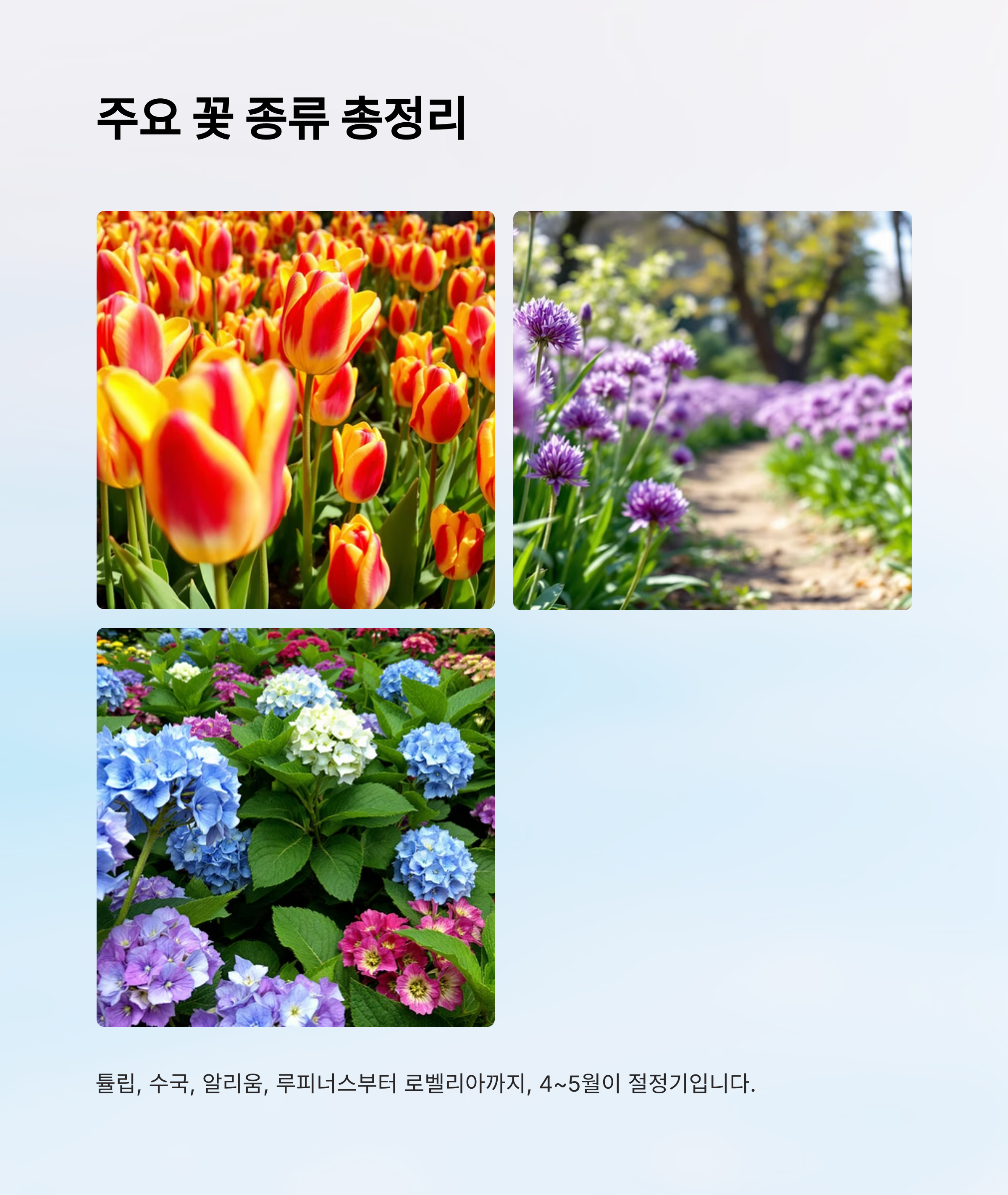 | 튤립 | 200여 종 이상의 화려한 색상 |