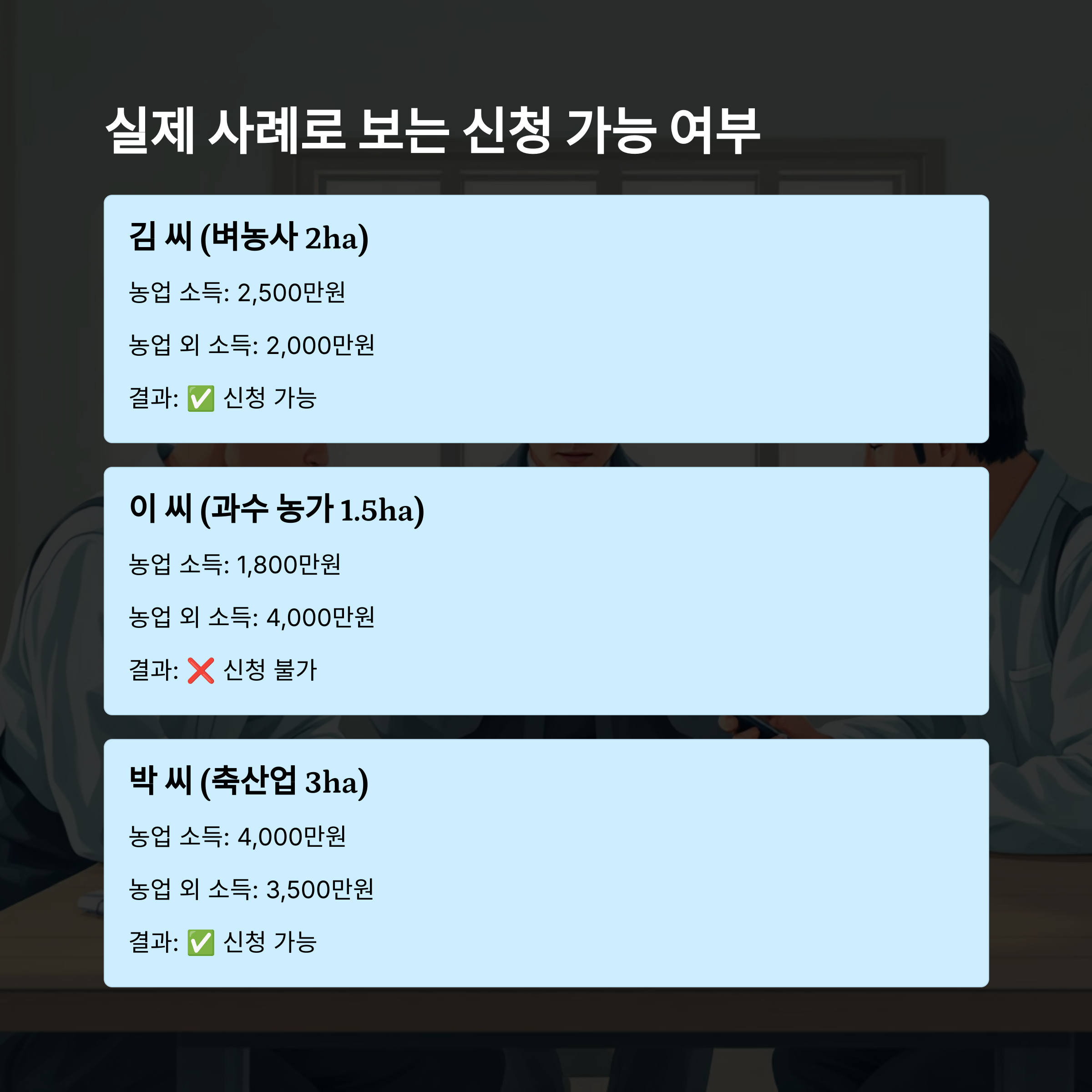 | 사례 | 농업 소득 | 농업 외 소득 | 신청 가능 여부 |