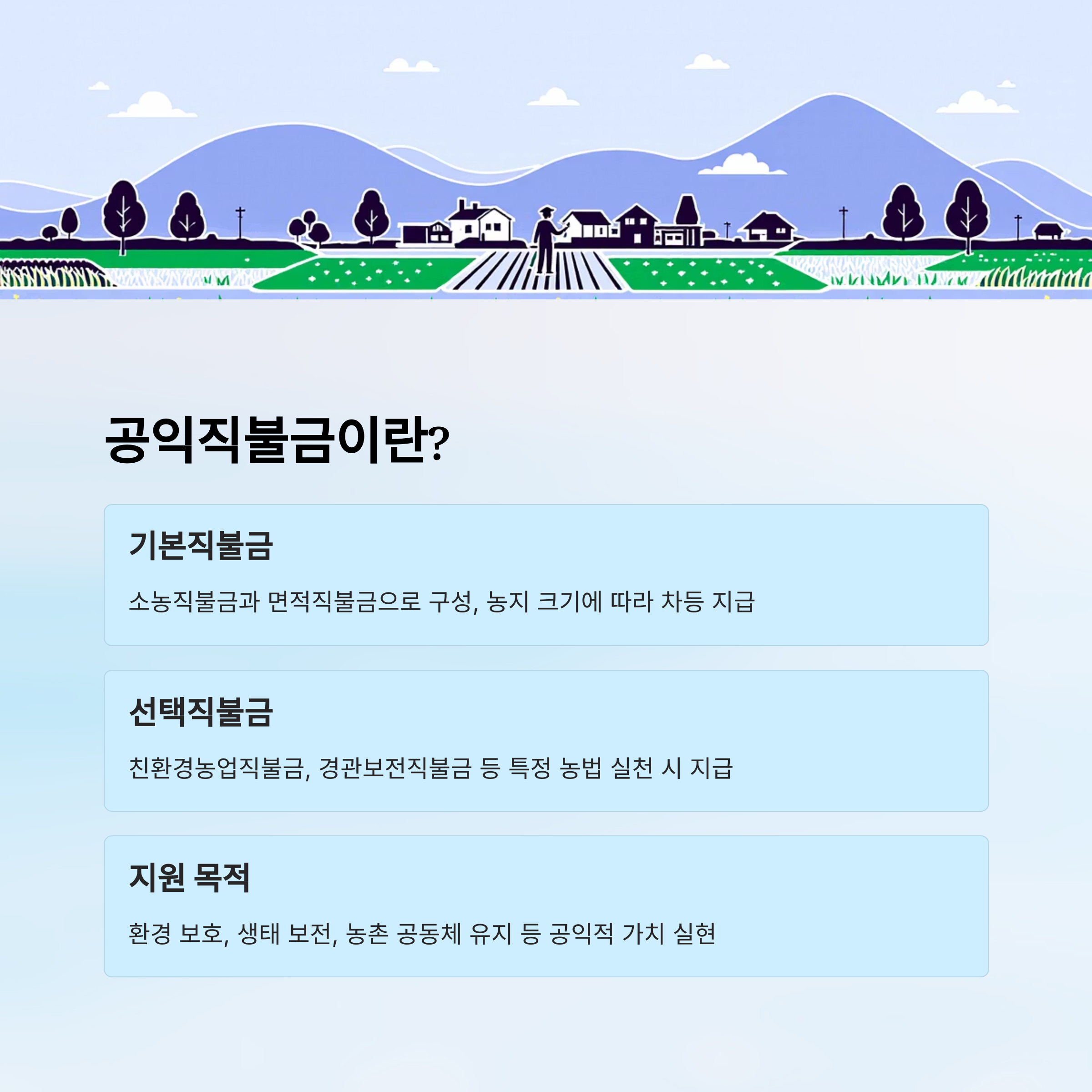 공익직불금은 농업인들이 환경 보호, 생태 보전, 농촌 공동체 유지 등 공익적 가치를 실현하도록 지원하는 정부 보조금이에요. 기존의 변동직불금과 고정직불금 제도를 통합해 2020년부터 시행되었어요.