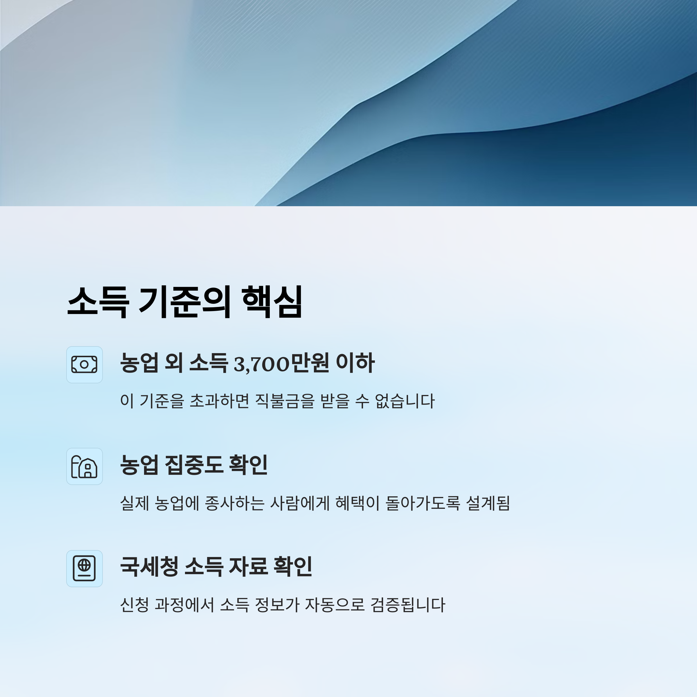 | 농업 외 소득 | 3,700만 원 이하 | 직불금 수령 가능 |