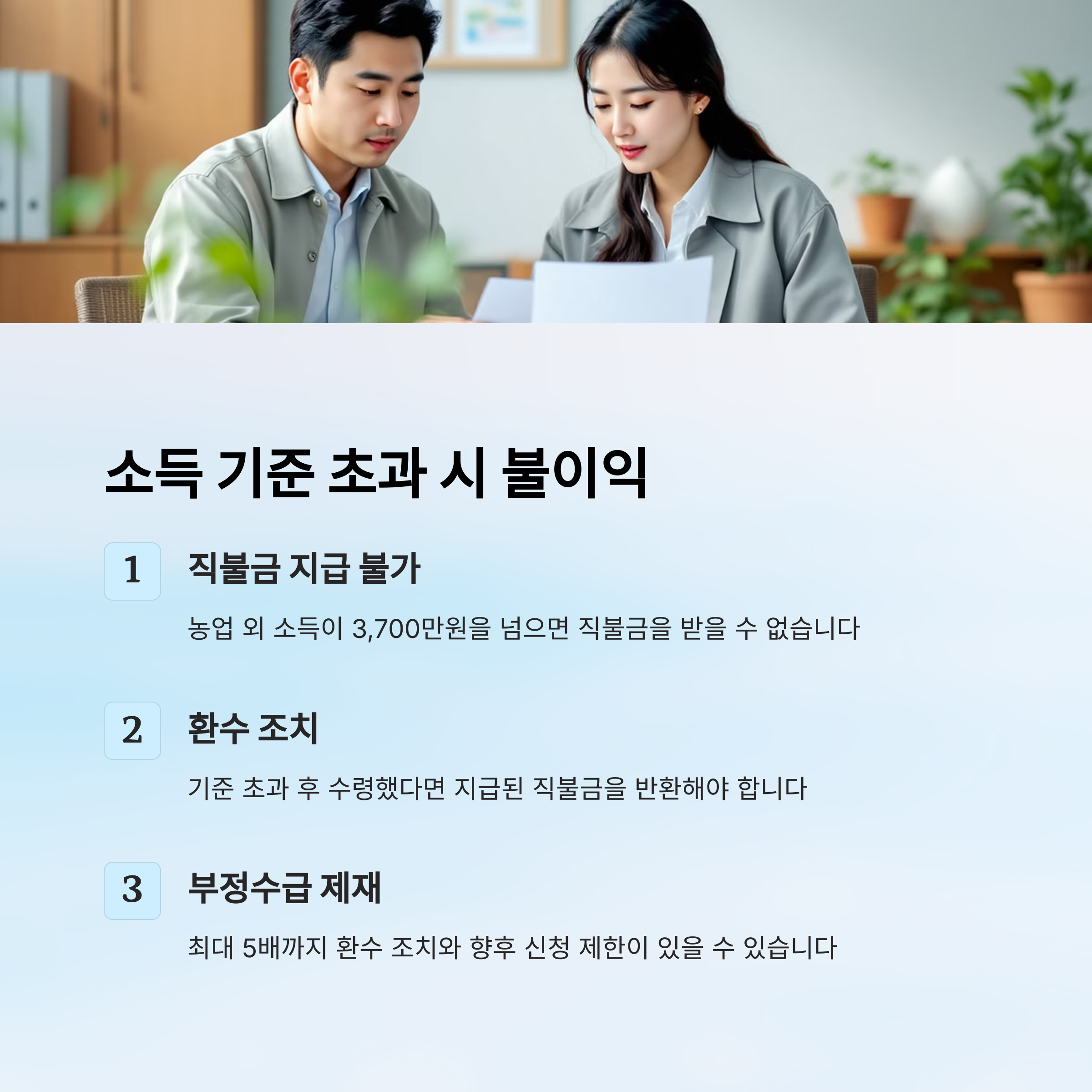 또한, 만약 소득 기준을 초과했음에도 불구하고 직불금을 수령했다면 향후 환수 조치가 이루어질 수 있어요. 심한 경우 부정수급으로 간주되어 벌금이나 지급 정지 등의 제재를 받을 수도 있답니다. 😨