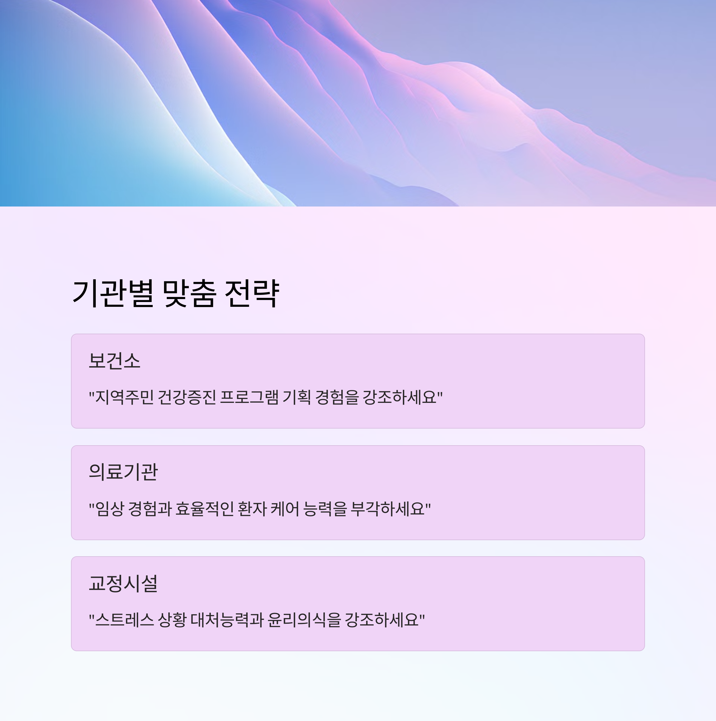 | 경험 기반 답변 | 실제 간호 경험과 배운 점 강조 | "보건소 캠페인에서 주민 건강 개선을 도왔어요." |