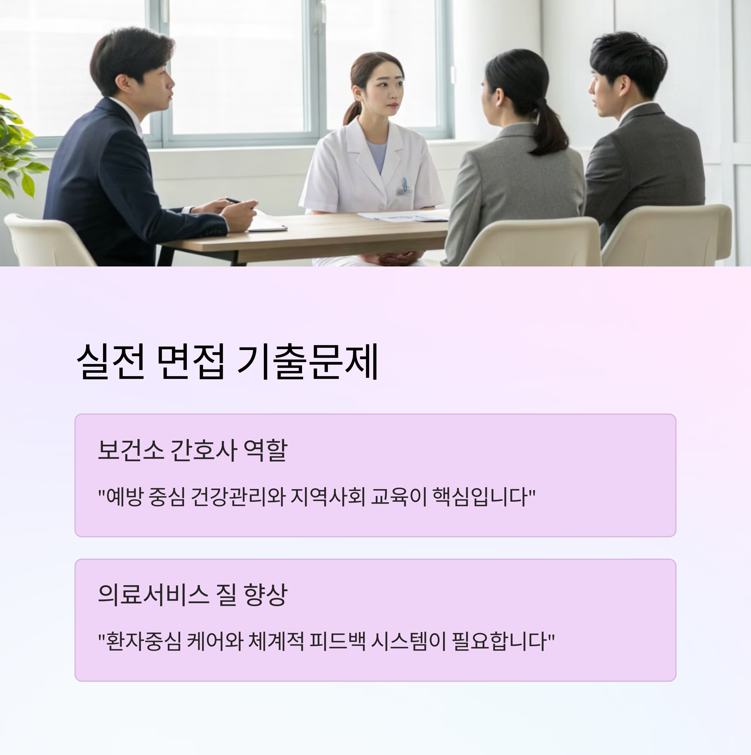 이처럼 합격자들은 논리적이고 경험을 바탕으로 한 답변을 준비했어요. 특히 면접관은 공무원으로서의 가치관과 간호사로서의 전문성을 동시에 보여주는 답변에 좋은 평가를 해요. 😊
