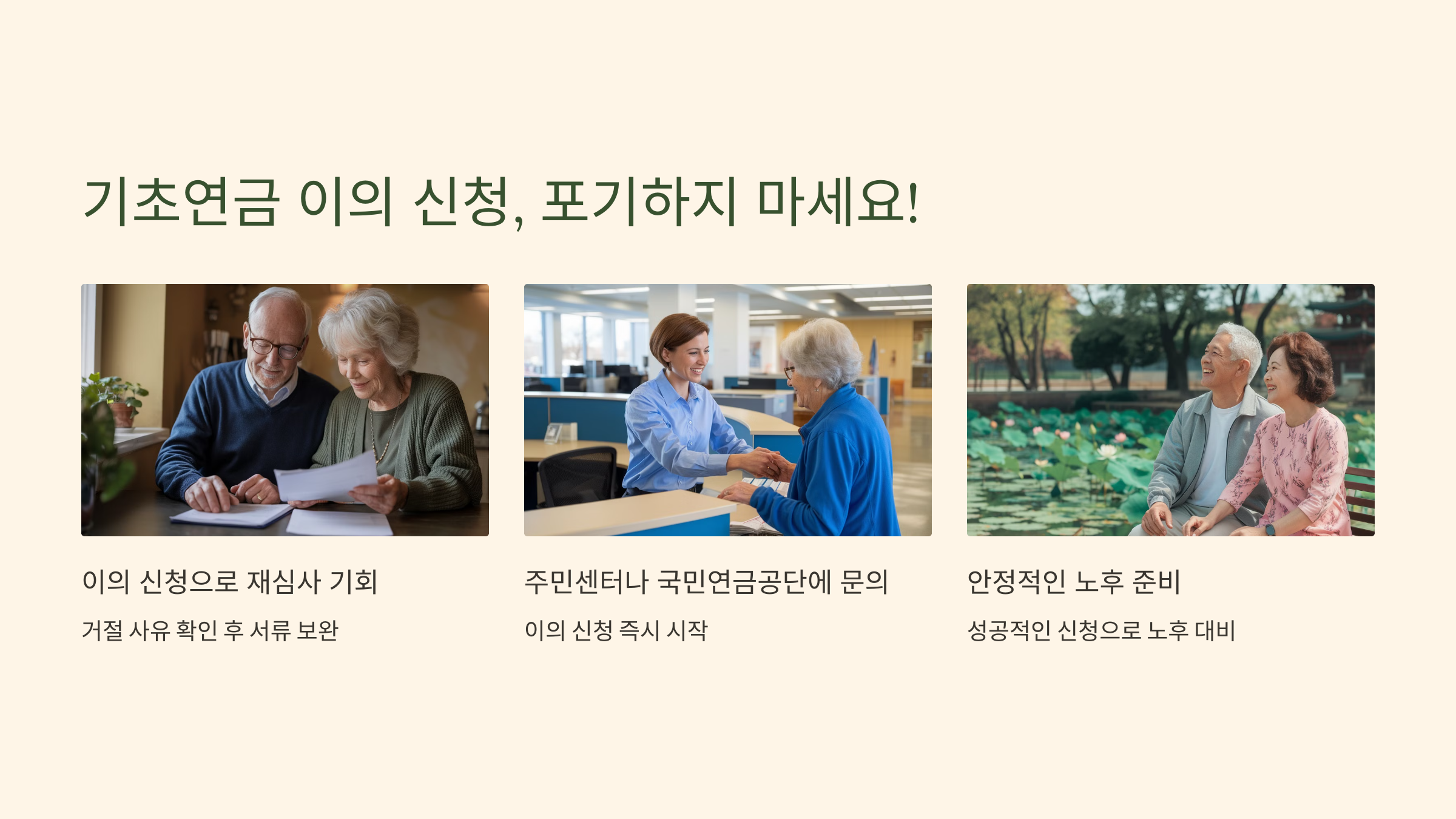 지금 바로 주민센터나 국민연금공단에 문의하여 이의 신청을 시작하세요. 성공적인 신청을 통해 안정적인 노후를 준비해 보세요! 😊