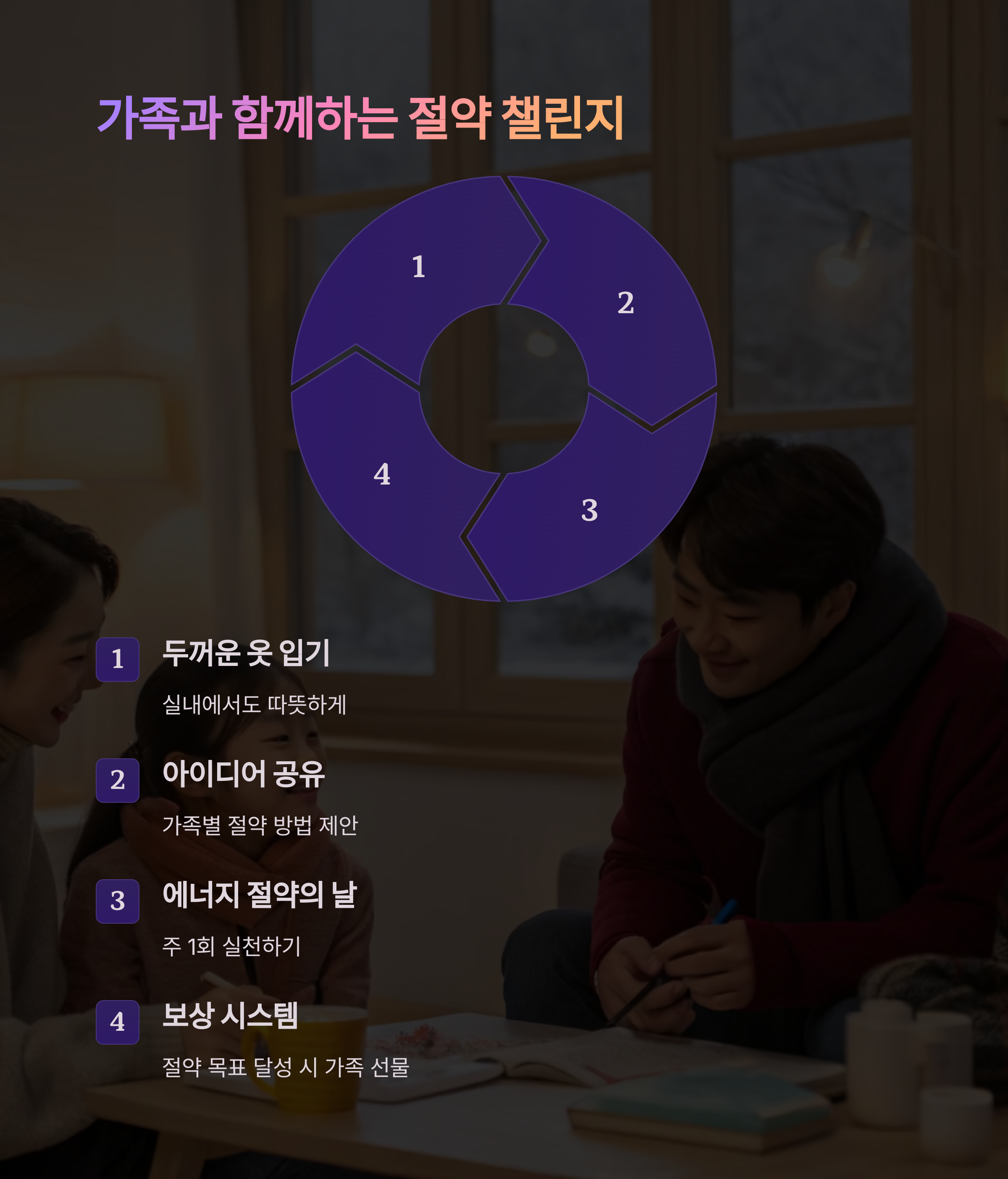 먼저, '절약 챌린지'를 만들어 보세요. 가족 구성원이 각자 난방 온도 조절, 샤워 시간 줄이기, 가전제품 대기전력 차단 등을 실천하고, 절약량을 비교해보는 거예요. 승자에게는 작은 선물을 주는 것도 좋은 동기부여가 돼요.