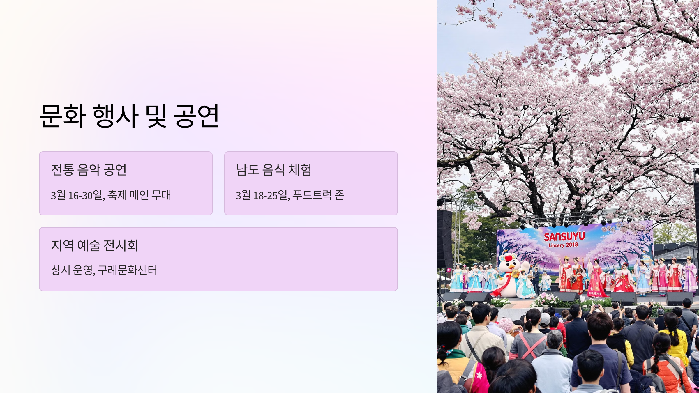 | 전통 음악 공연 | 3월 16일 ~ 3월 30일 | 축제 메인 무대 |