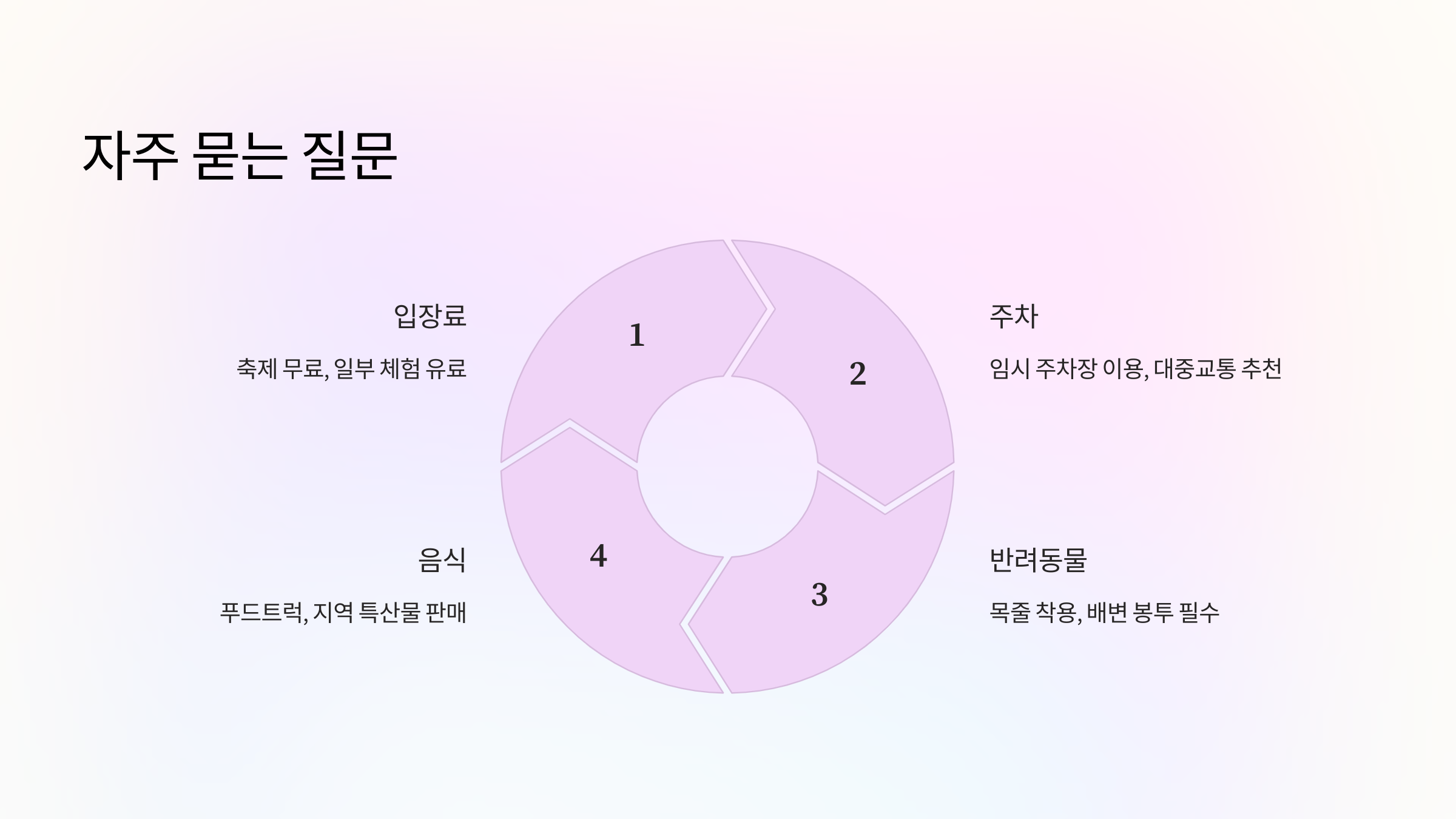A1. 축제 자체는 무료예요. 다만 일부 체험 프로그램은 유료일 수 있어요.