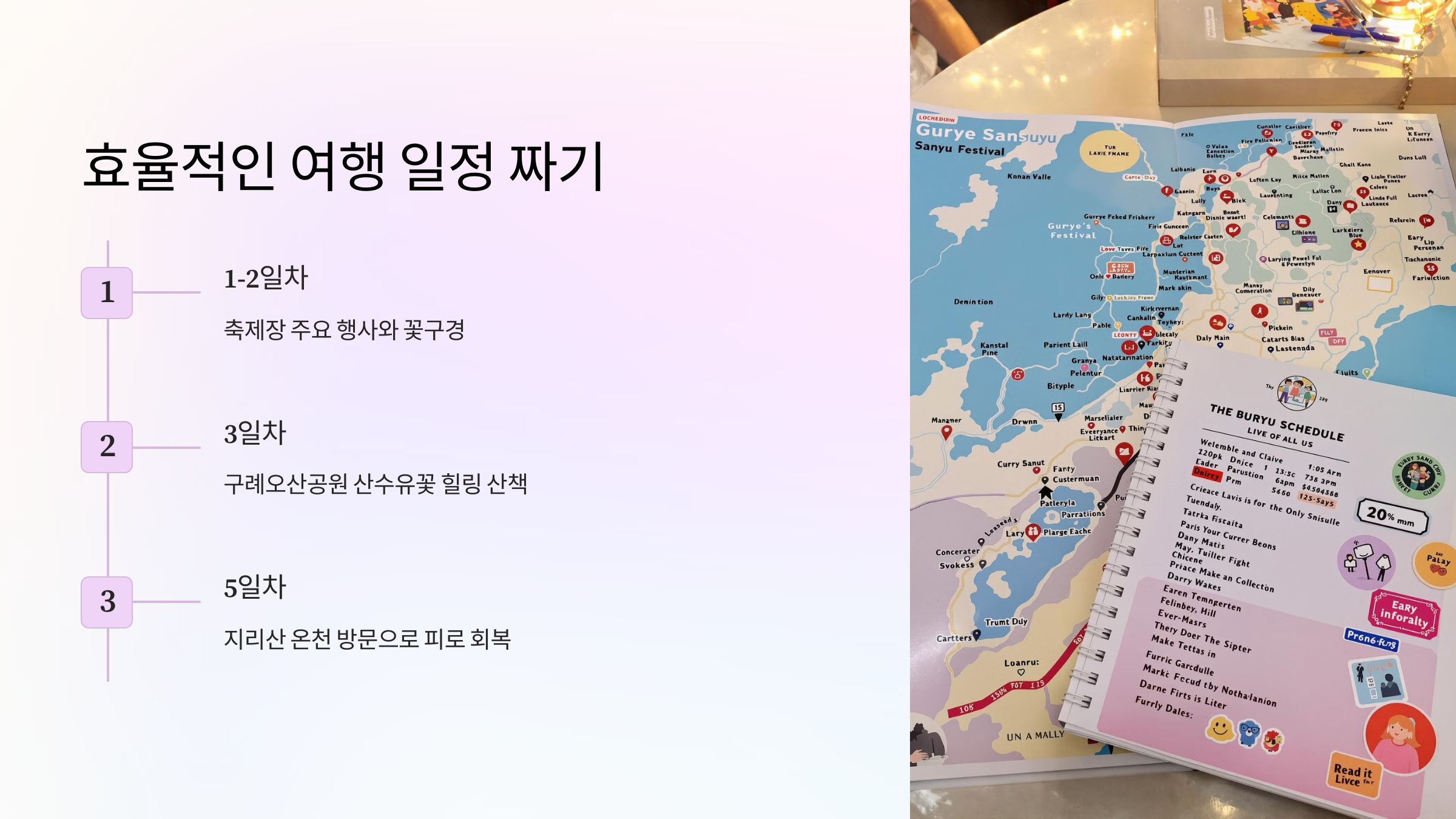 구례산수유꽃축제를 일주일 동안 즐기려면 여행 일정을 잘 짜야 해요. 하루에 모든 것을 다 보려고 하기보다는 여유 있게 일정을 잡는 게 좋아요. 주요 이벤트와 구례 주변 관광지를 함께 계획하면 알찬 여행이 될 거예요.