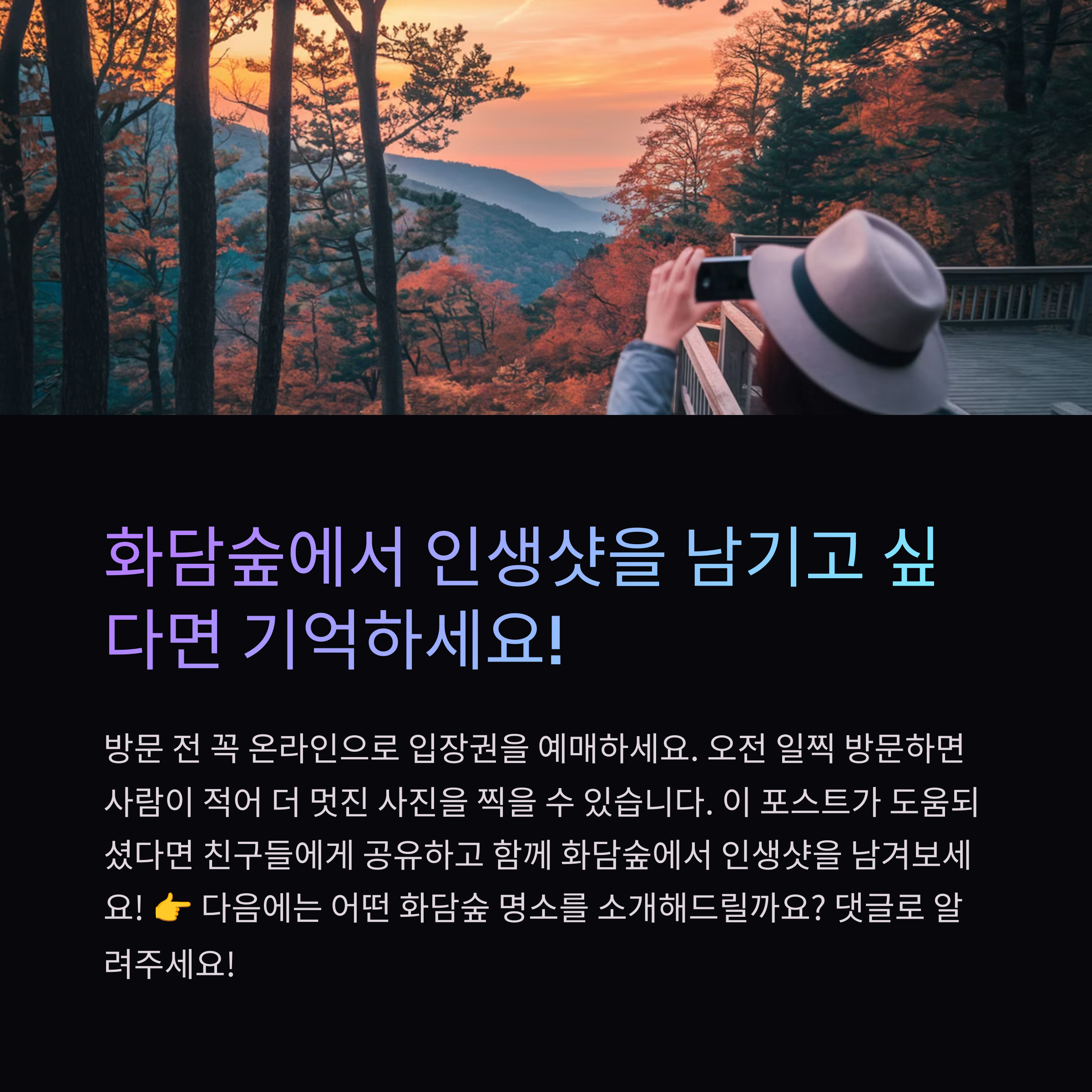 특히 화담숲에는 꼭 사진을 남겨야 하는 인기 포토존이 많아요. 단풍나무 길, 메타세쿼이아 길, 수국 정원 등 어디서 찍어도 그림 같은 풍경이 펼쳐지죠. 이번에는 '인생샷'을 남기기 좋은 화담숲 포토존 TOP 5를 소개할게요! 😊