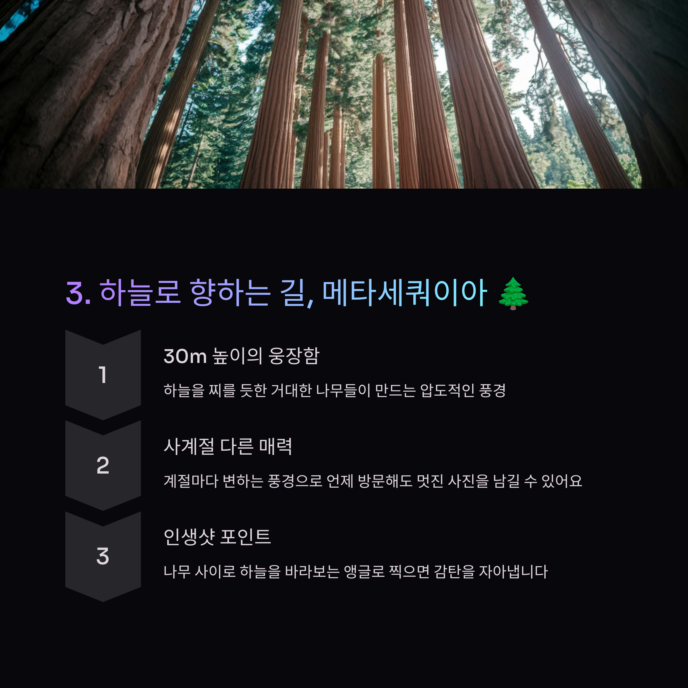🌲 메타세쿼이아 길은 가을(10~11월)과 겨울(12~1월)에 가장 분위기 있어요. 이 시기에 방문하면 환상적인 숲길을 걸으며 멋진 사진을 찍을 수 있어요.