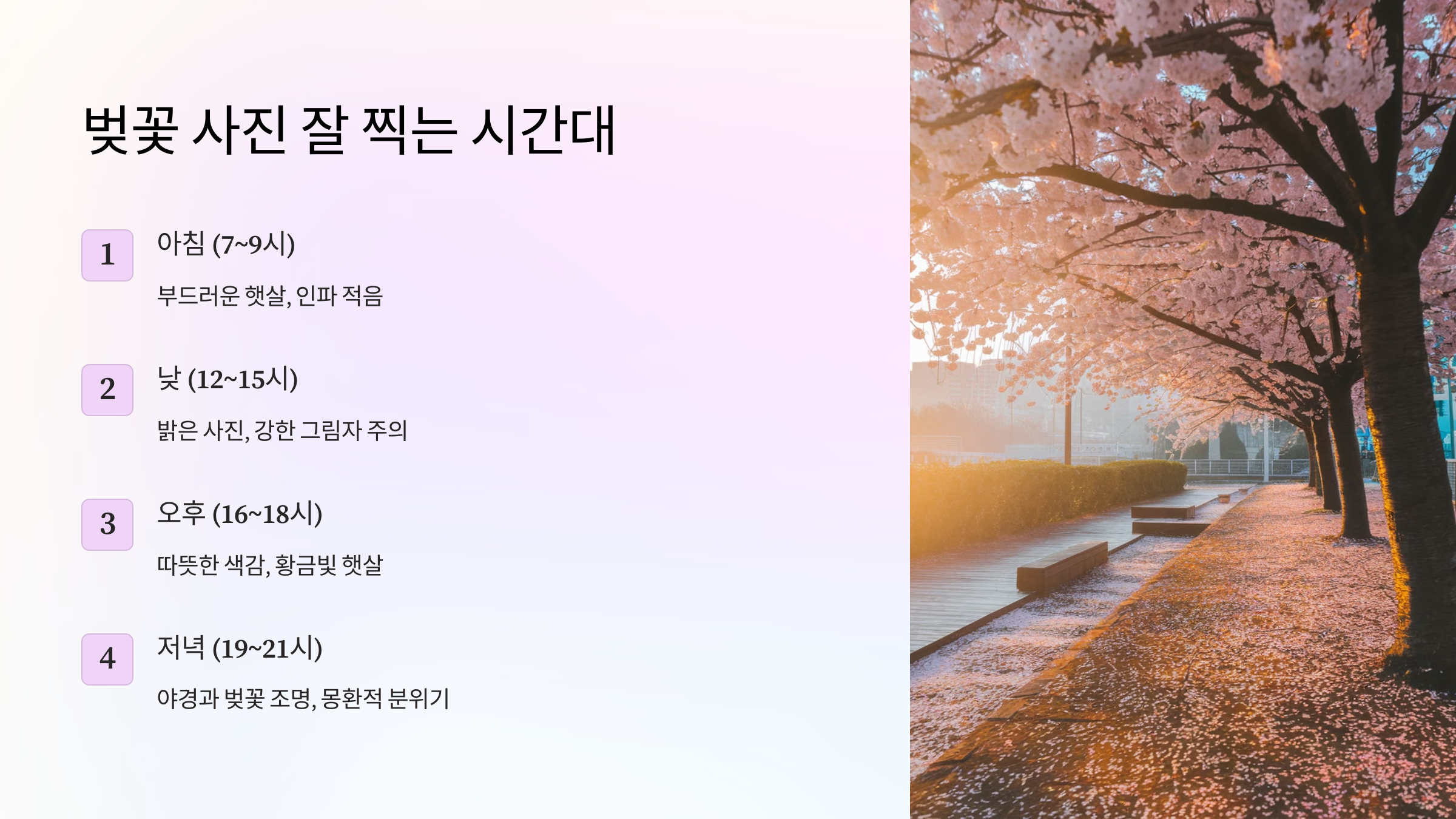 이제 어떤 시간대에 촬영해야 최고의 벚꽃 사진을 남길 수 있는지 알아볼까요? 😊