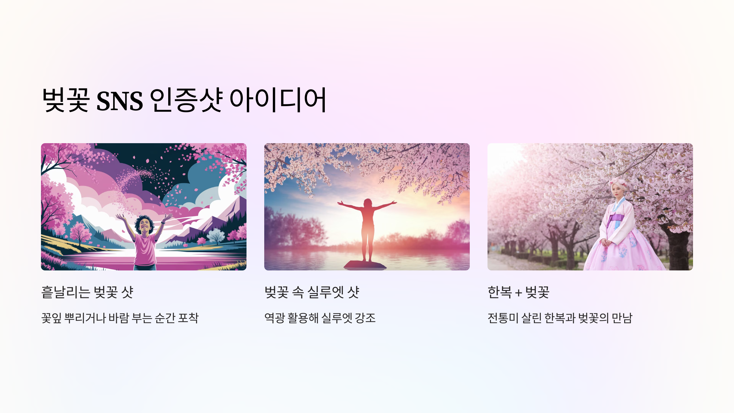 벚꽃 시즌에는 SNS에 감성 가득한 사진을 올리고 싶죠? 💕 하지만 매년 찍는 벚꽃 사진이 비슷하게 느껴진다면 색다른 연출법을 시도해 보세요!