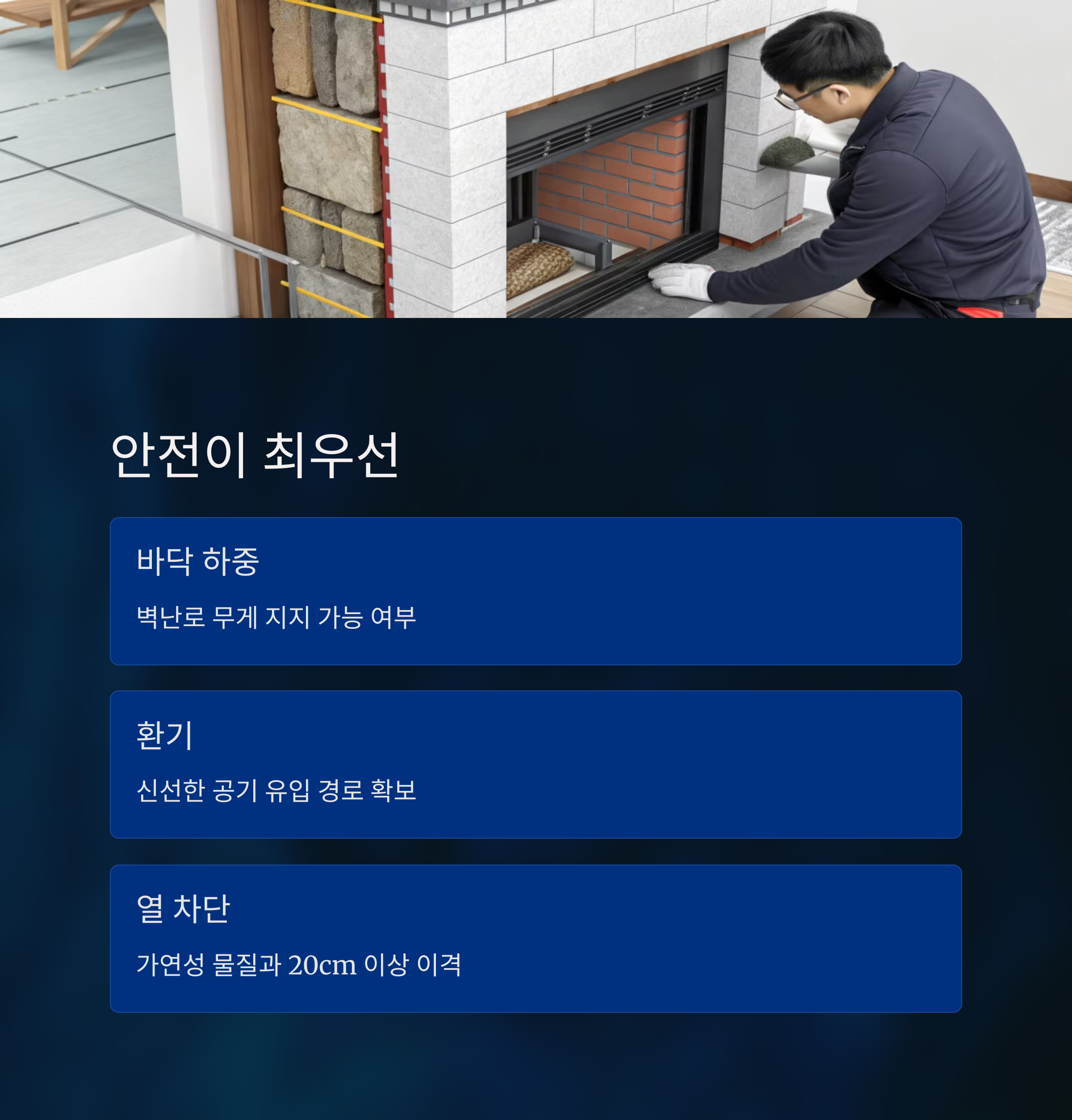 추운 겨울, 따뜻한 벽난로 앞에서 보내는 시간은 상상만으로도 아늑하죠. 하지만 벽난로 설치는 단순히 예쁜 인테리어 요소가 아니라, 구조적·법적·안전적인 요소를 꼼꼼히 따져봐야 하는 작업이에요.