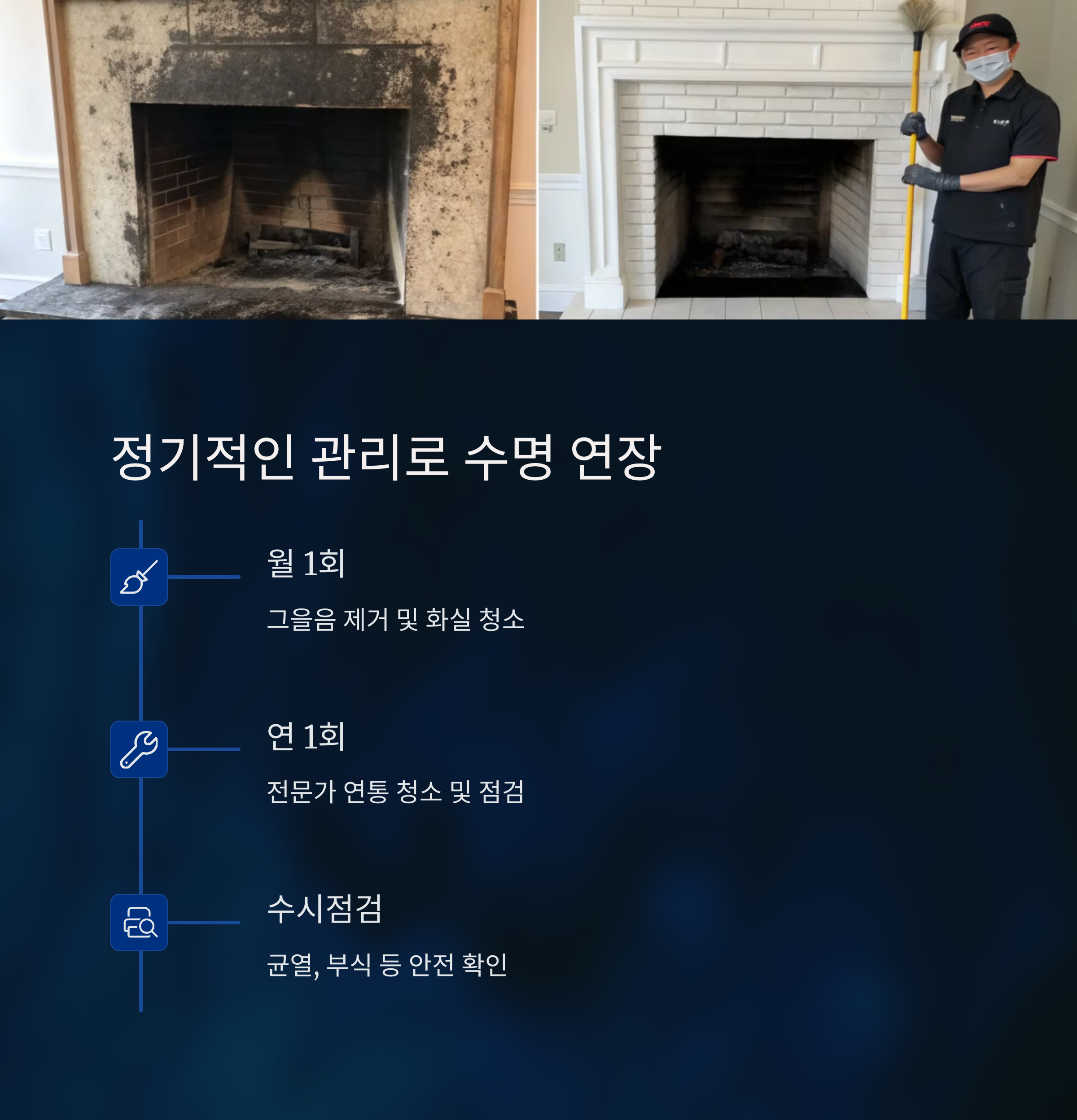 벽난로는 정기적인 관리가 필수예요. 그렇지 않으면 연기 배출이 원활하지 않거나 화재 위험이 높아질 수 있어요.