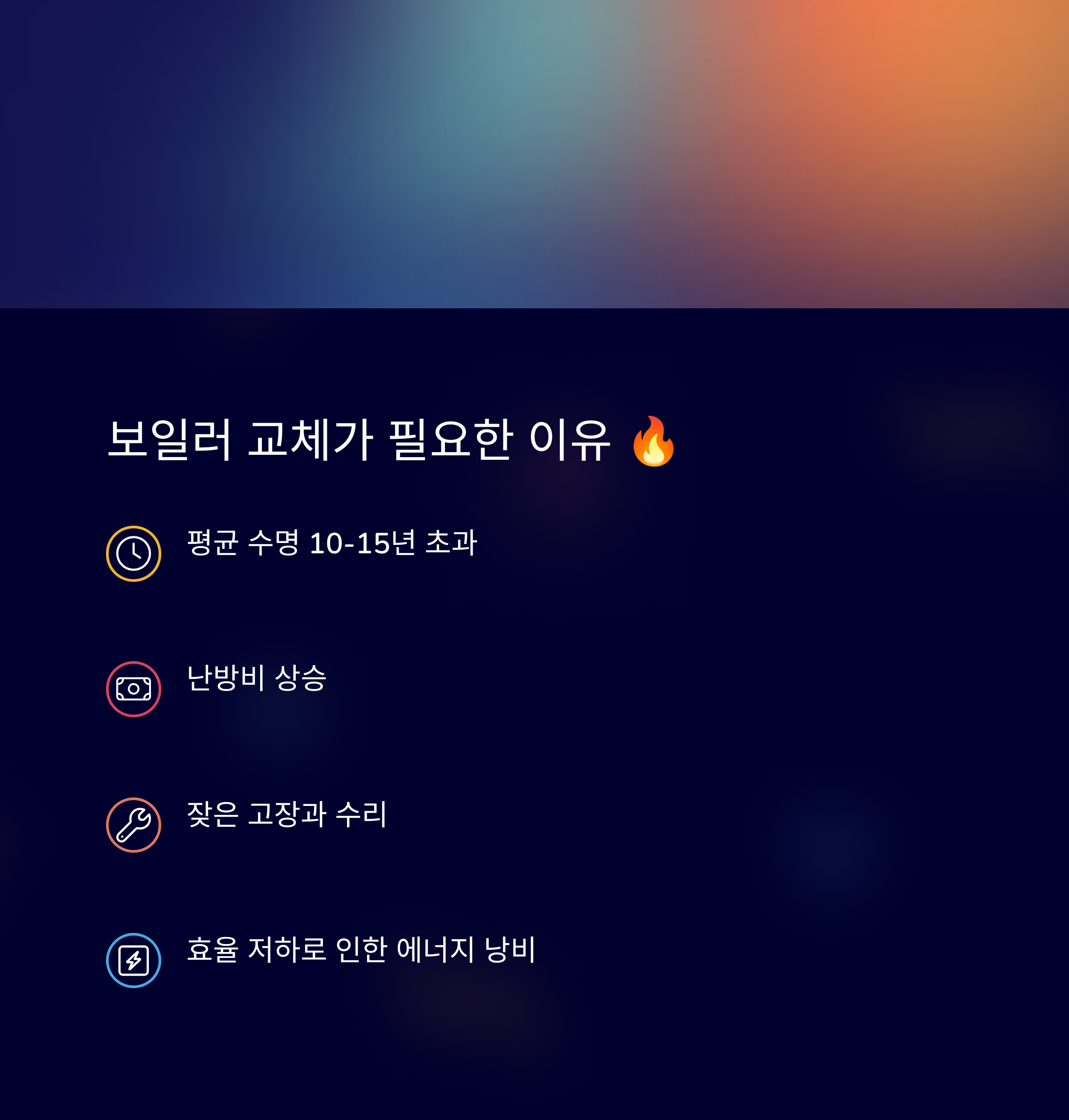 보일러는 집안의 난방과 온수를 책임지는 필수 가전이에요. 하지만 보일러도 **수명이 있기 때문에 일정 기간이 지나면 교체가 필요해요.** ⏳