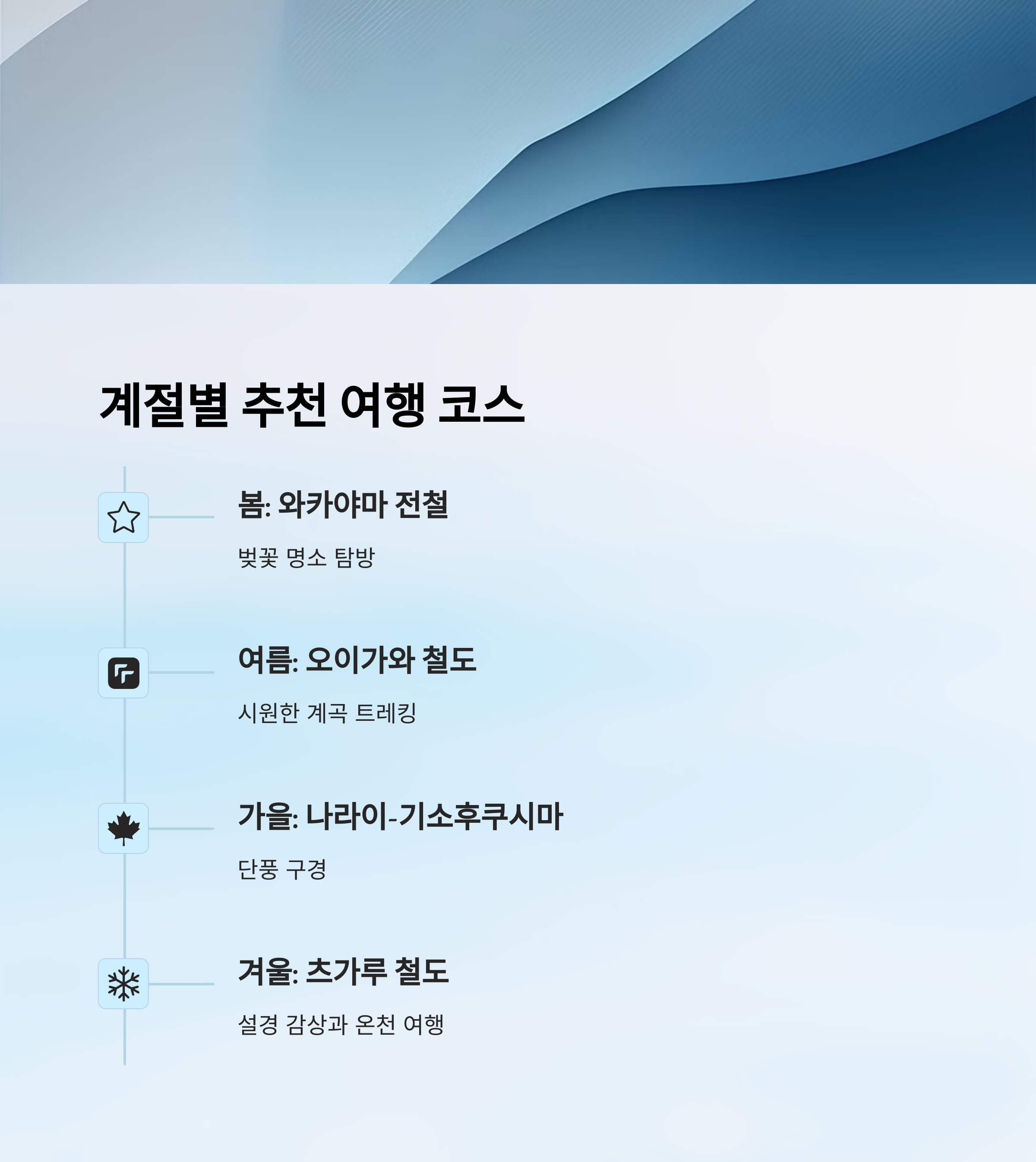 A6. 네! 봄에는 *히사카리선(벚꽃)*, 여름에는 *오이가와 철도(녹음과 강)*, 가을에는 *산인 본선(단풍)*, 겨울에는 *츠가루 철도(설경)*을 추천해요. ❄️🍁