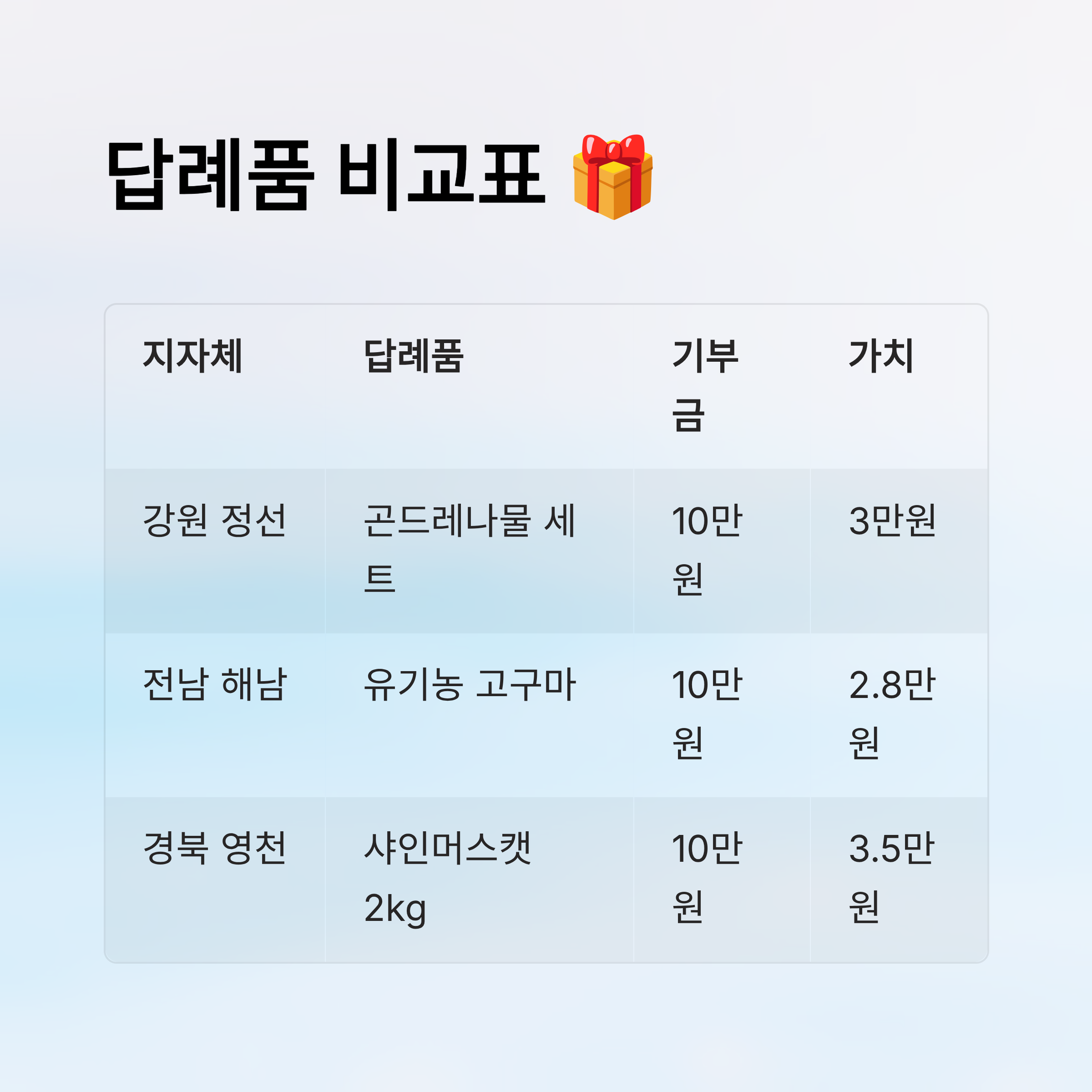 | 지자체 | 답례품 종류 | 기부금액 | 답례품 금액 | 비고 |