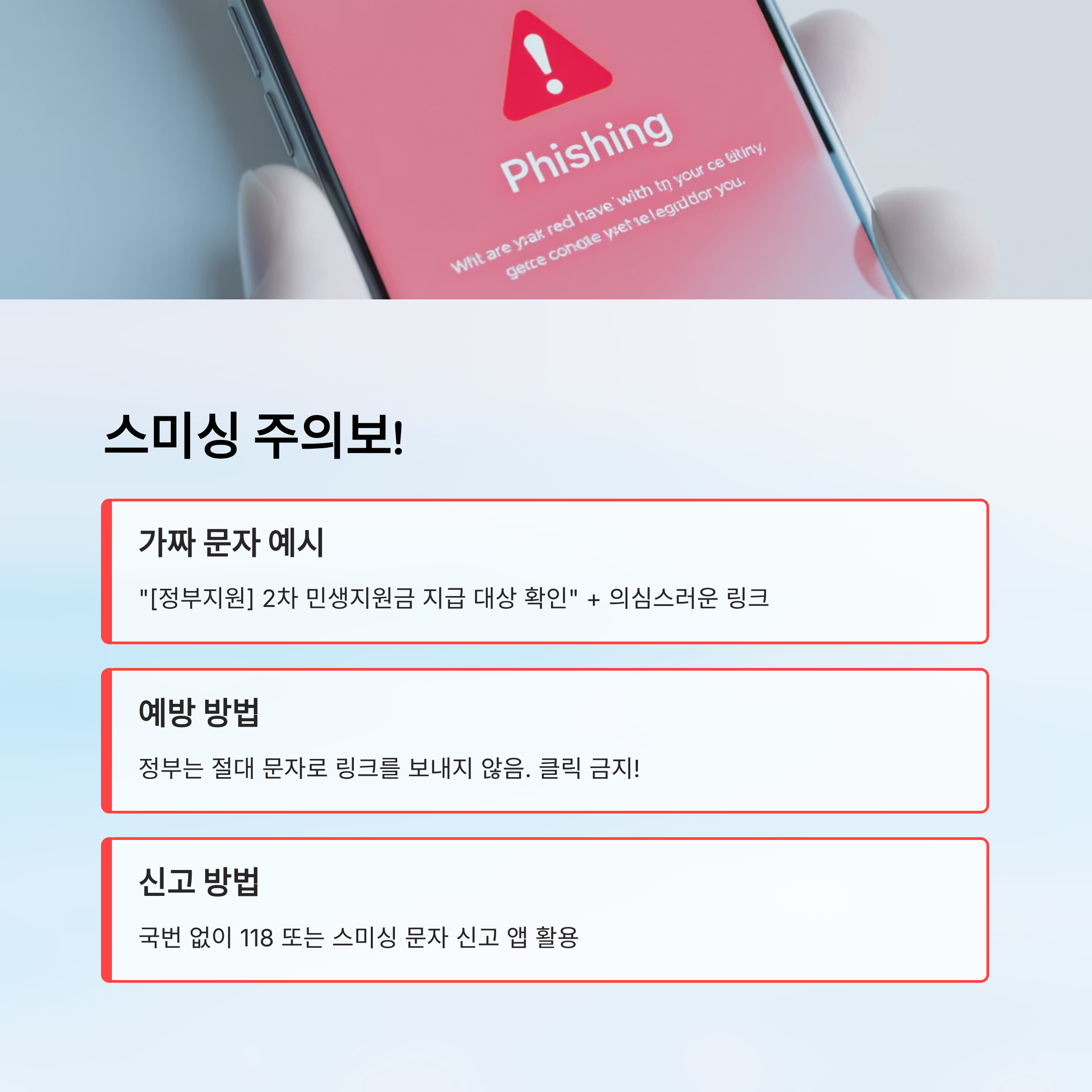 스미싱을 피하는 가장 좋은 방법은 **링크 클릭하지 않기**예요. 정부 기관은 절대 문자로 링크를 보내지 않아요. 모든 신청은 직접 포털에 로그인해서 확인하게 되어 있어요. 문자, 카톡, SNS에서 날아오는 지원금 관련 링크는 무조건 의심해야 해요 🔍