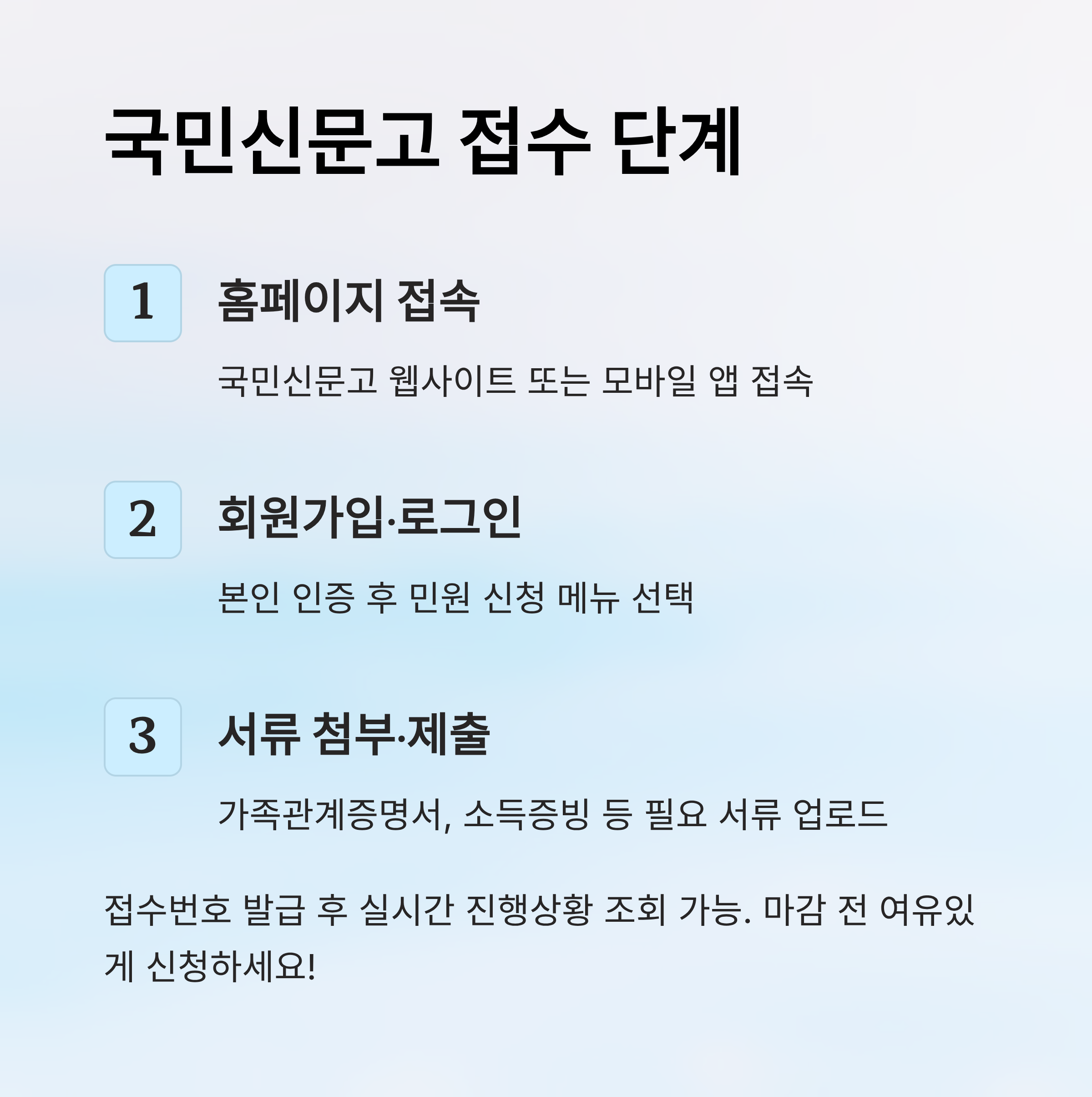 | 온라인 (국민신문고) | 접속 → 본인 인증 → 신청서 작성 → 증빙 첨부 → 제출 | 소득증빙, 가족관계증명서 등 |