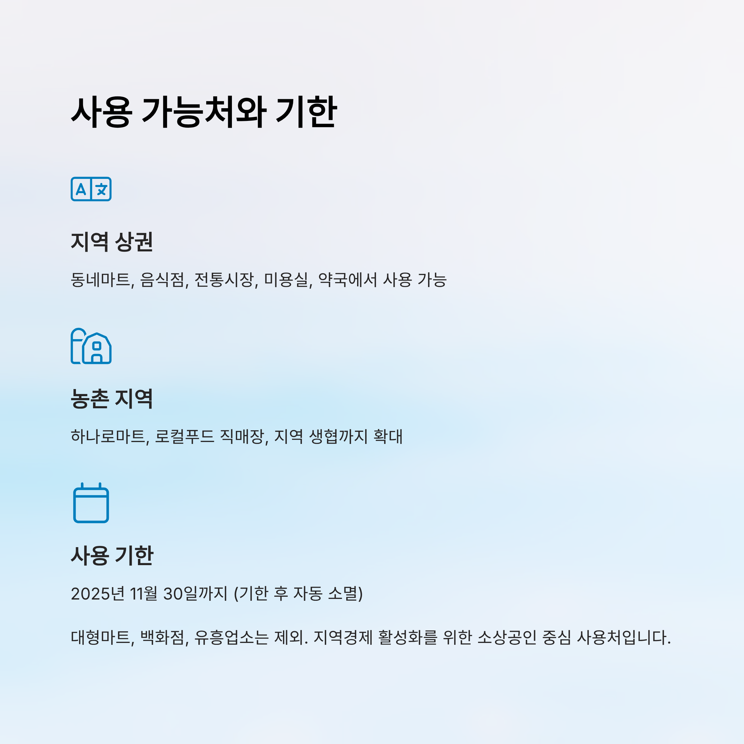 사용 기한은 2025년 11월 30일까지예요. 만약 이 기한 안에 사용하지 않으면 자동으로 소멸돼요. 현금으로 환불받을 수 없기 때문에 계획적으로 사용하는 게 좋아요. 특히 연말 전에 기한이 끝나는 만큼, 추석 명절이나 가을 소비 시즌에 맞춰 쓰면 알뜰하게 활용할 수 있답니다.