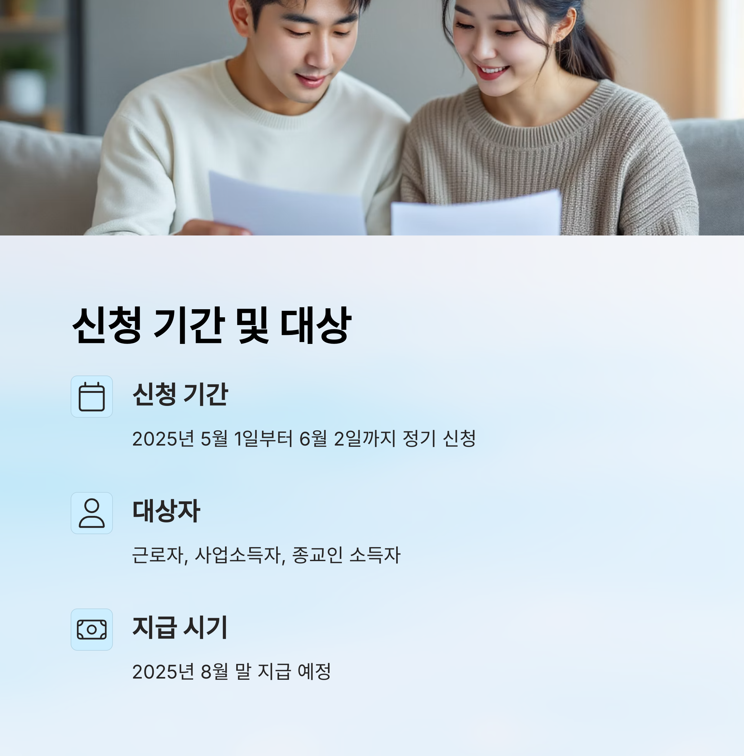 이번 제도는 저소득 근로자, 사업자, 종교인 소득자를 대상으로 하며, 가구 유형과 소득, 재산 요건을 충족하면 신청할 수 있어요. 특히 올해부터는 맞벌이 가구 소득 요건이 완화되면서 더 많은 분들이 혜택을 받을 수 있게 되었답니다. 준비만 잘하면 한 가구당 최대 300만 원 이상도 받을 수 있다는 점! 👍
