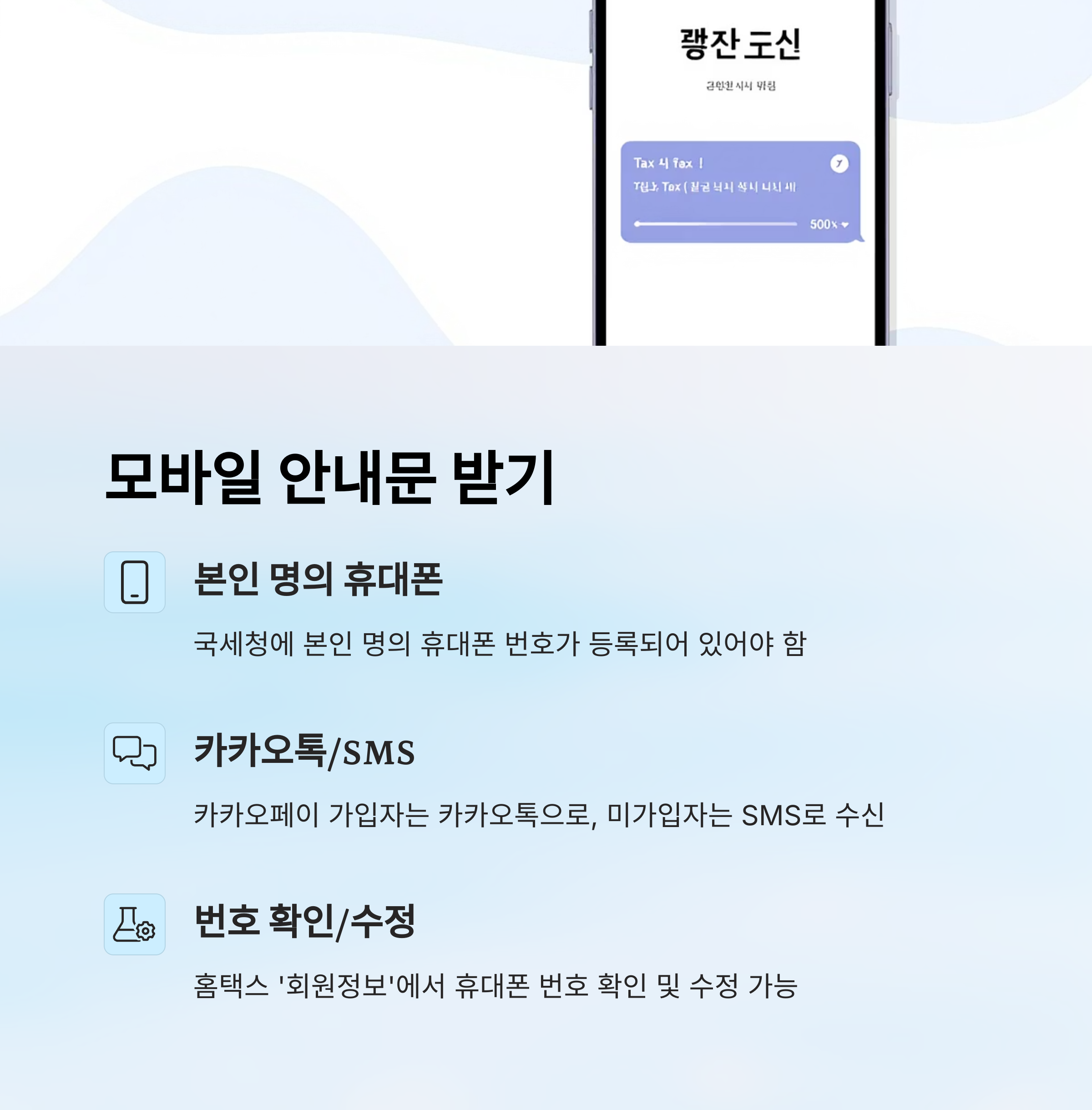 | 모바일 안내문 | 카카오톡, 문자 | 본인 명의 휴대폰 필요 |