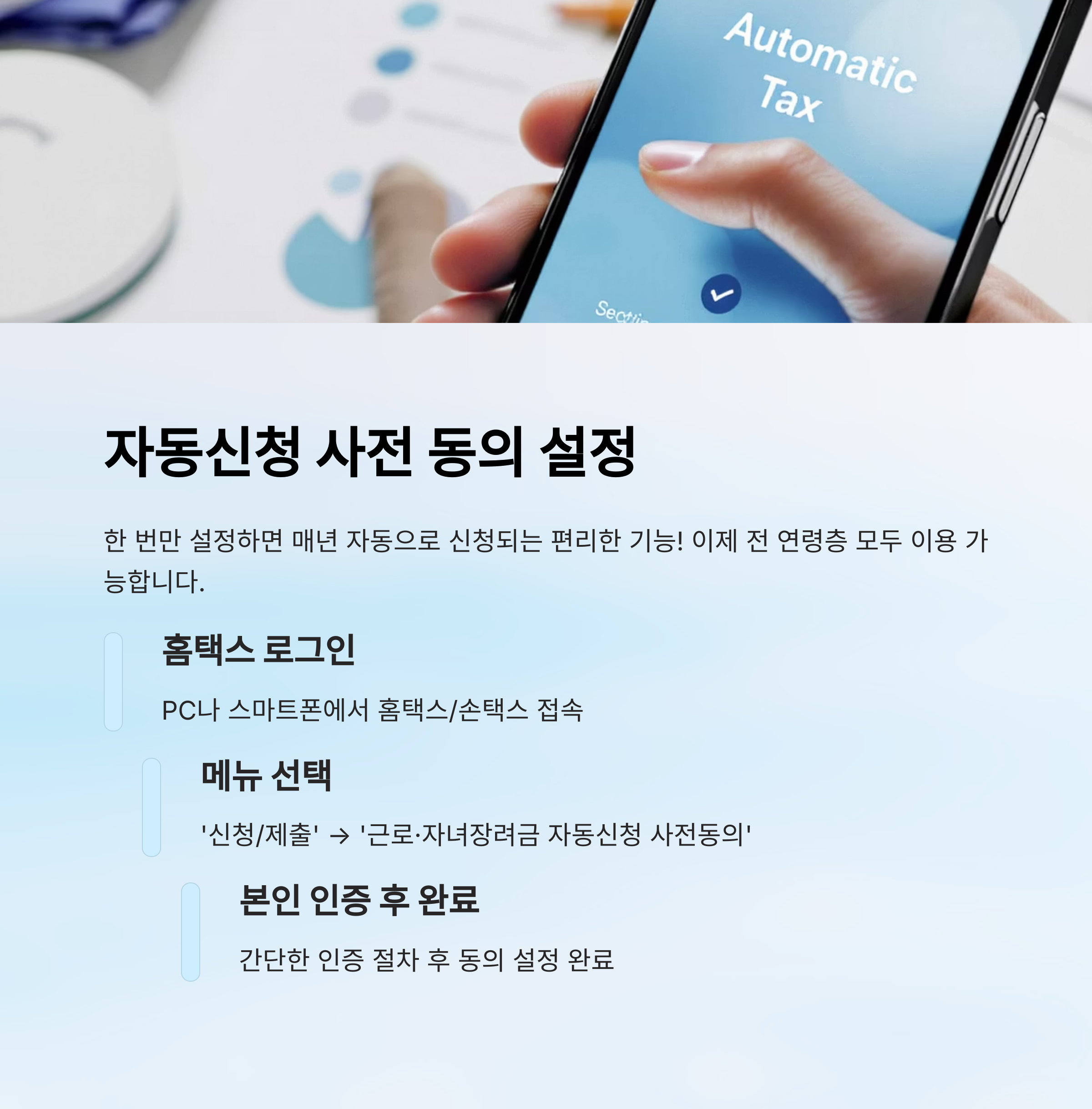 홈택스를 통해 설정하려면, PC 또는 스마트폰에서 로그인 후 [신청/제출] 메뉴에 들어가서 [근로·자녀장려금 자동신청 사전동의] 항목을 선택하면 돼요. 본인 인증 후 동의 절차만 따라가면 자동 등록 완료! 정말 간단해요. 😊