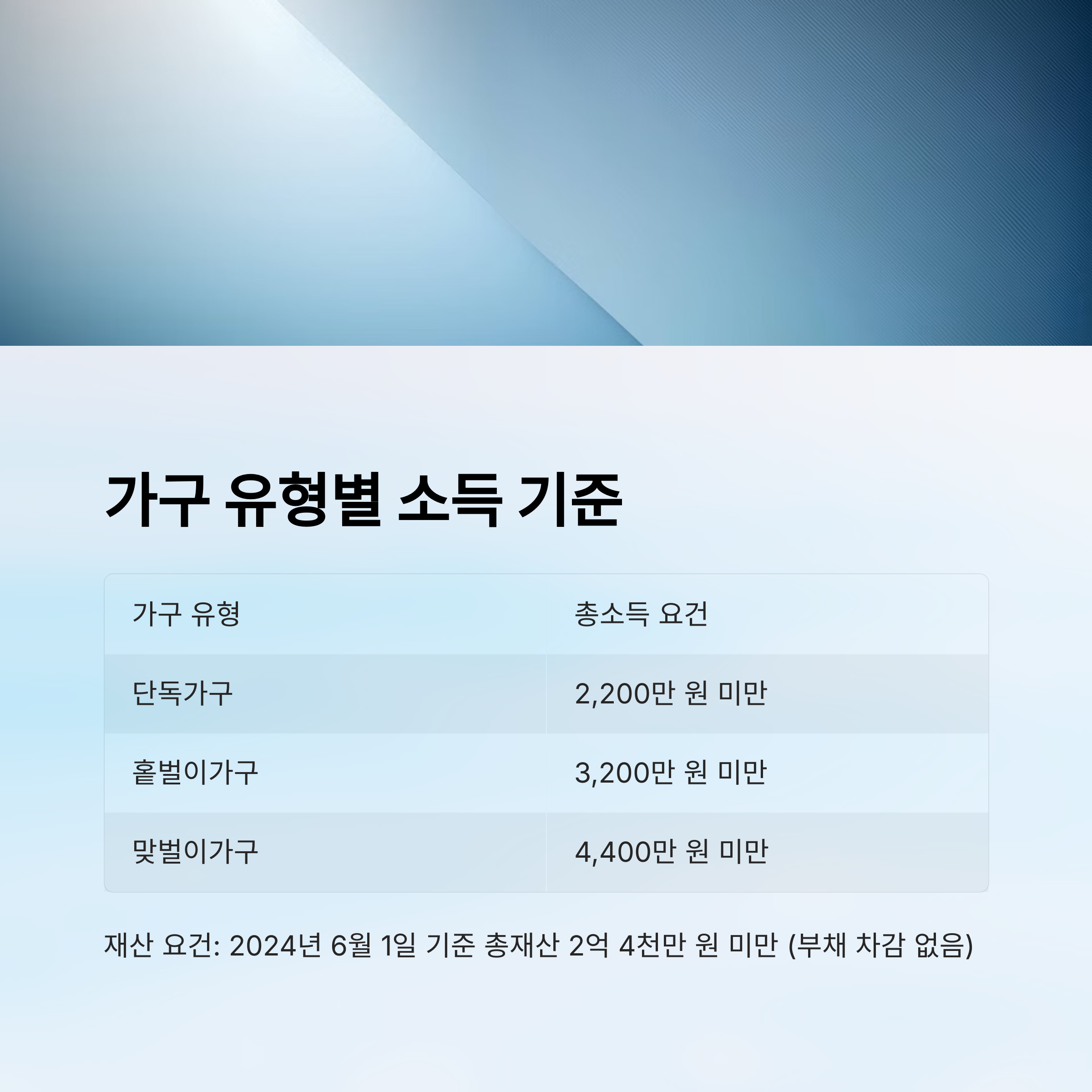 | 단독가구 | 배우자·자녀·직계존속 없음 | 2,200만 원 미만 | 해당 없음 |