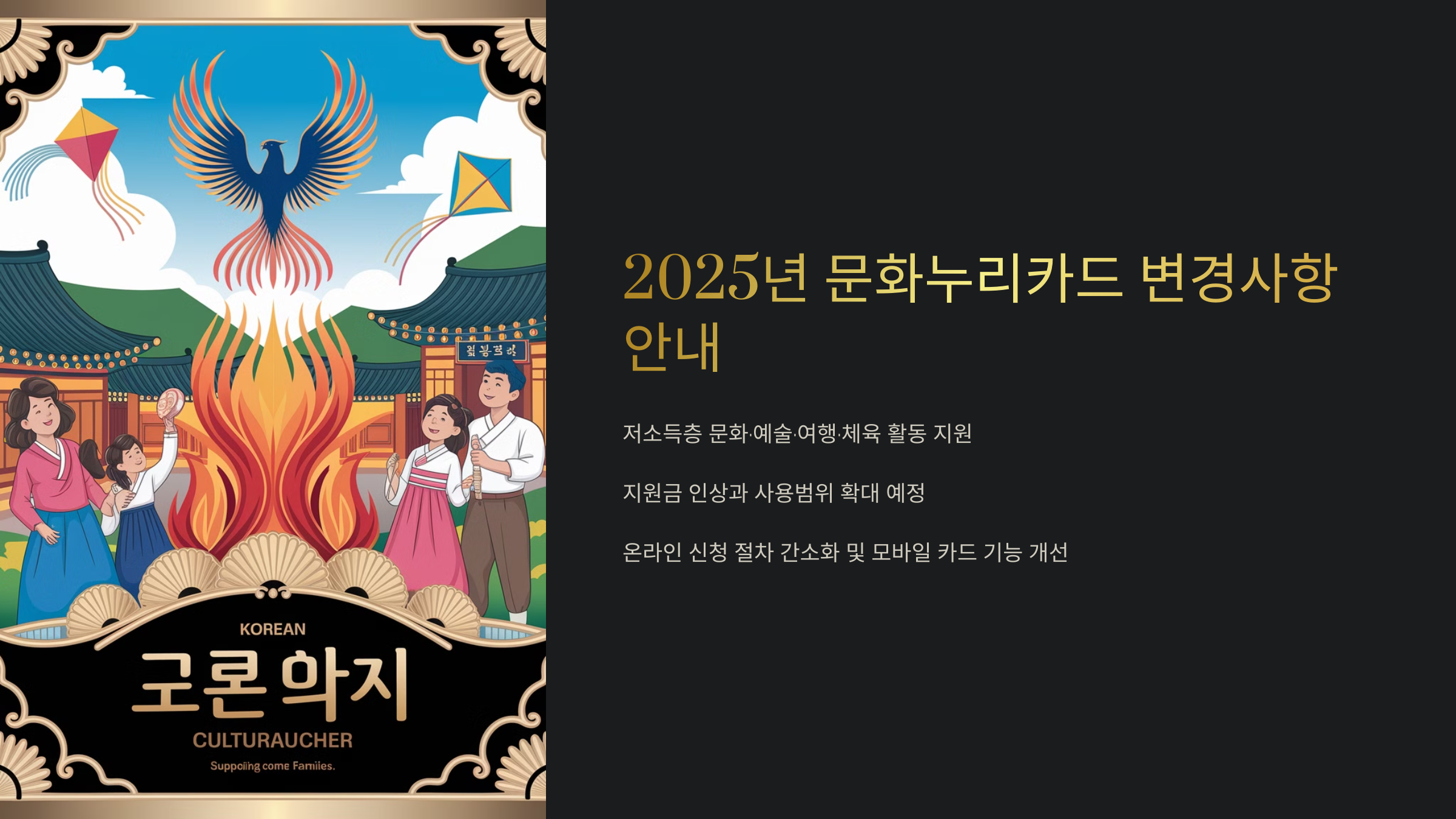 문화누리카드는 저소득층의 문화·예술·여행·체육 활동을 지원하기 위해 정부에서 제공하는 복지 카드예요. 매년 지원금과 혜택이 달라지는데, 2025년에는 몇 가지 중요한 변화가 있어요. 올해 신청을 계획하고 있다면, 변경된 사항을 꼭 확인해두는 것이 좋아요!