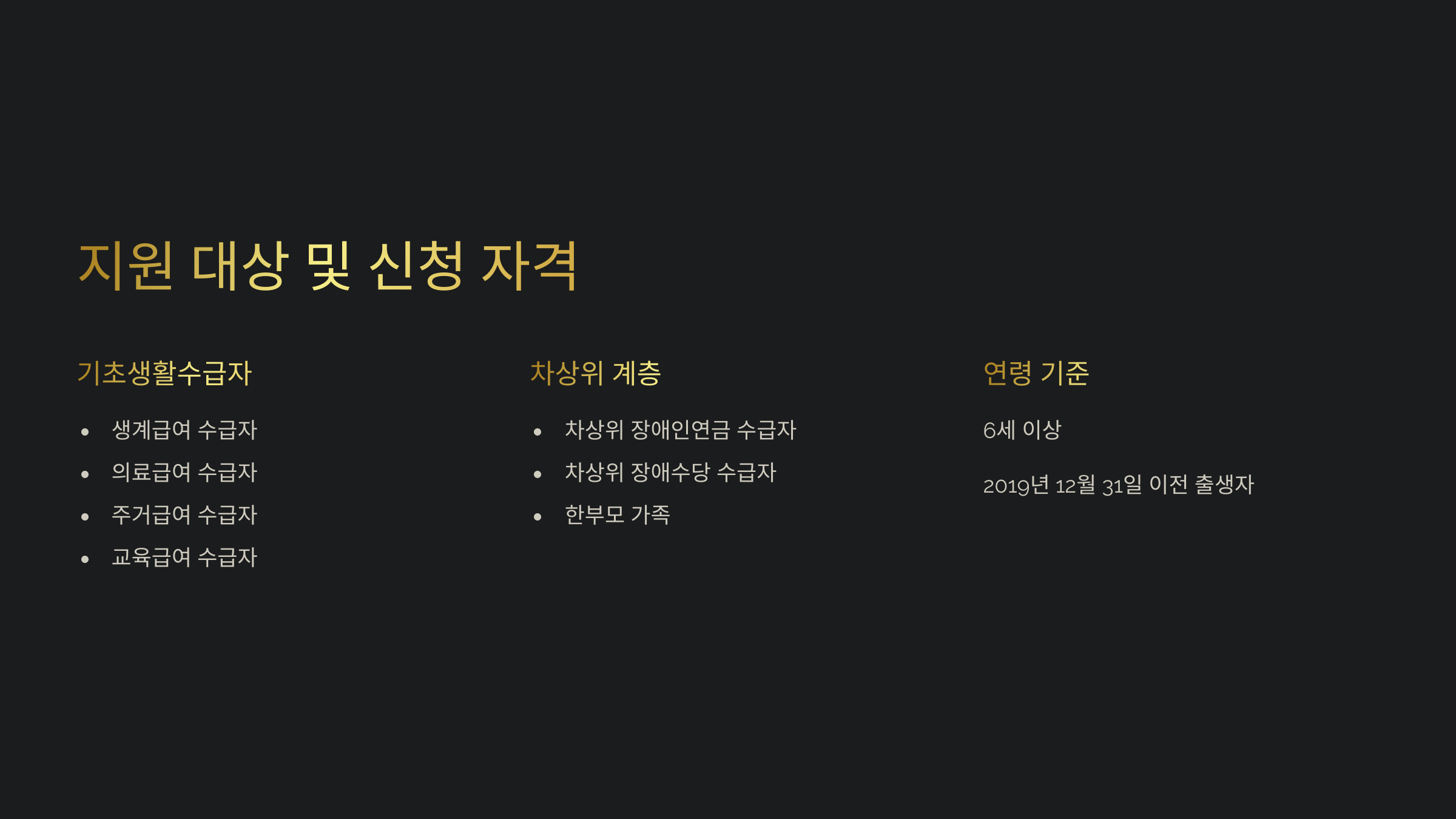 | 지원 대상 | 기초생활수급자 및 차상위 계층 |