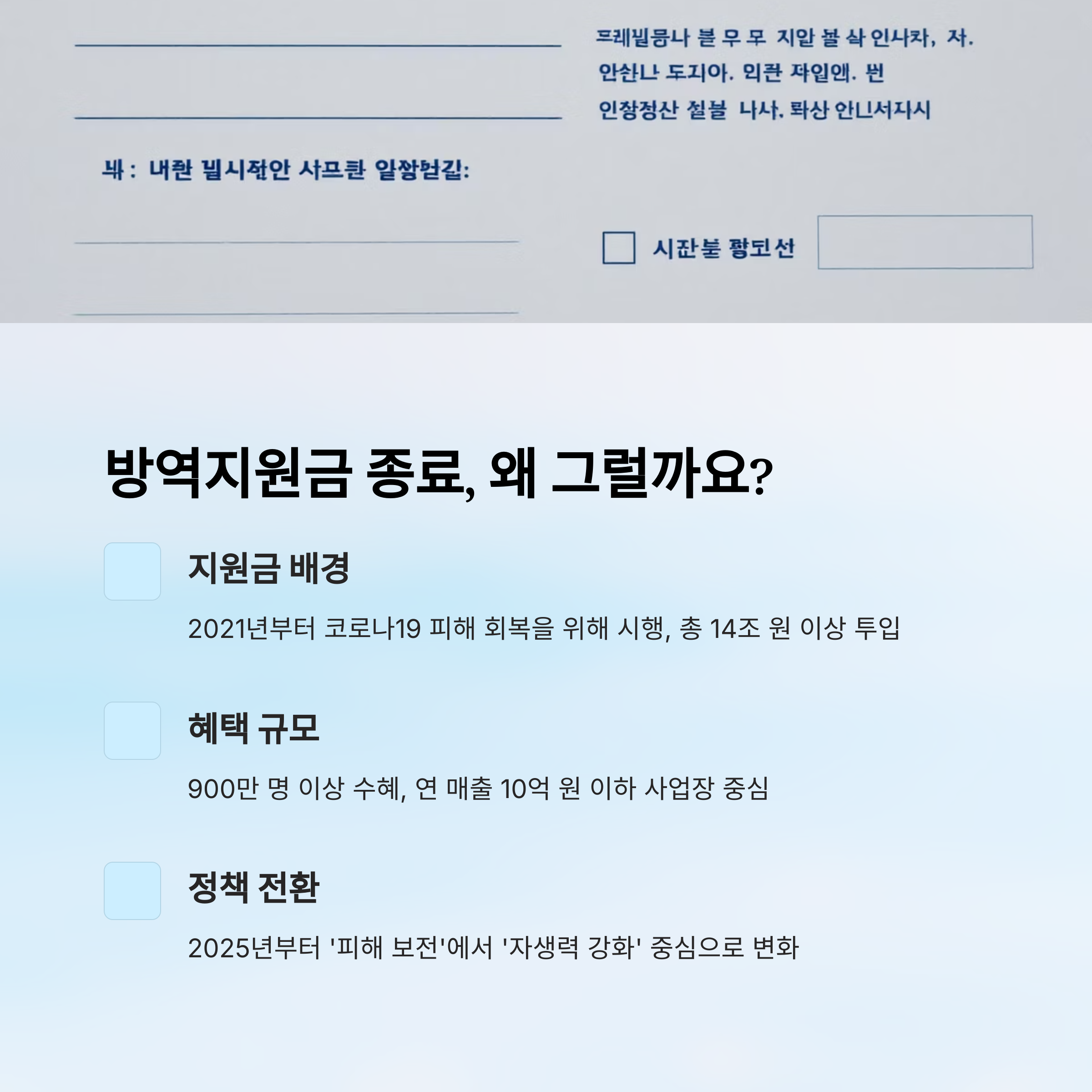 2022년부터 코로나19로 인해 위축된 영세 사업자와 소상공인을 위해 정부는 방역지원금을 지급해 왔어요. 하지만 2025년 들어와 코로나19 방역 정책이 종료되면서 해당 지원금 역시 막을 내리게 되었죠.