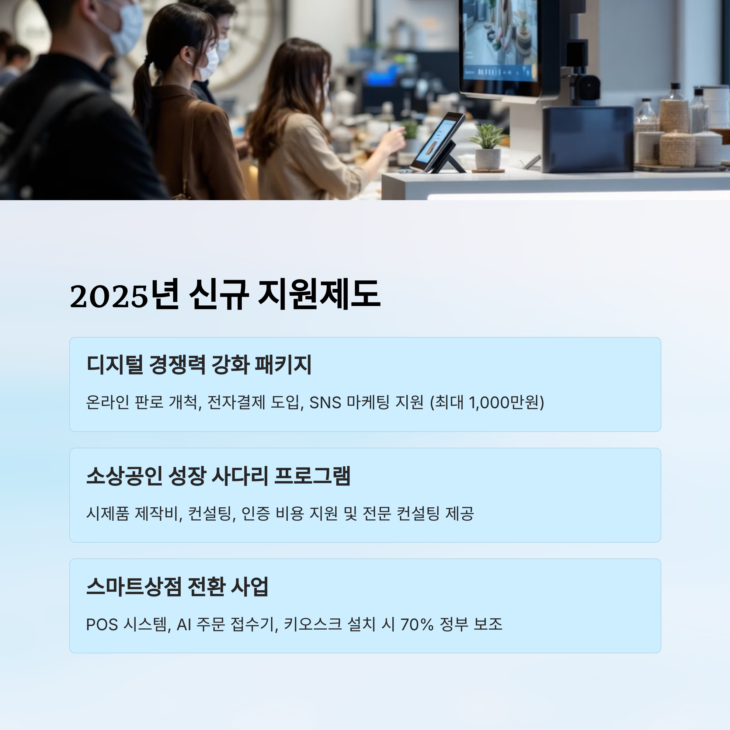 2025년부터 도입된 새로운 소상공인 지원제도는 자립과 지속가능성을 중심에 두고 있어요. 가장 대표적인 게 '디지털 경쟁력 강화 패키지'예요. 이 사업은 온라인 판로 개척, 전자결제 도입, SNS 마케팅 등을 도와주는 실무형 지원이에요.