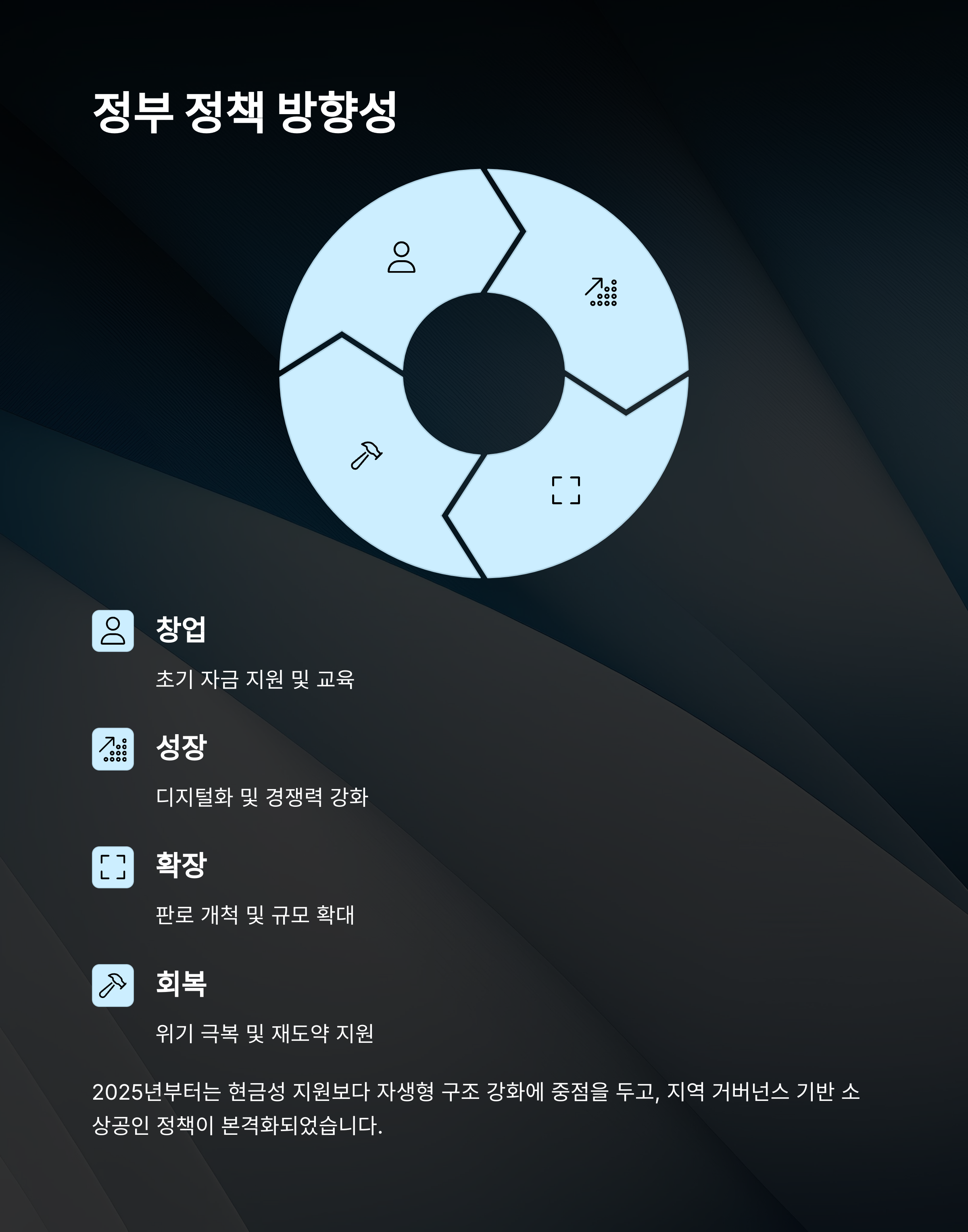 2025년 현재 정부는 ‘현금성 지원’에서 ‘자생형 구조 강화’로 정책 기조를 바꿨어요. 방역지원금처럼 즉각적인 지원보다는, 장기적으로 스스로 살아남을 수 있는 기반을 만들어주는 것이 핵심이에요.