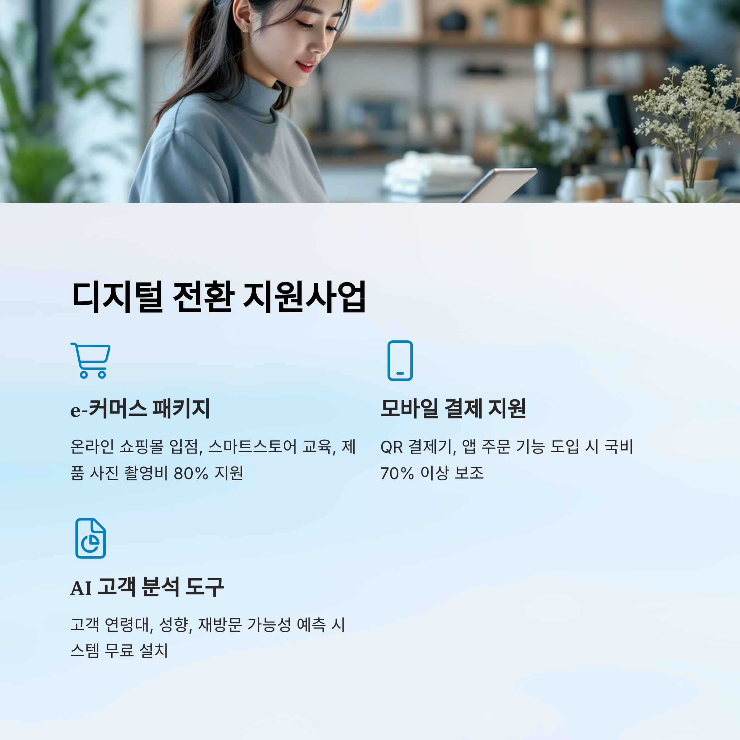2025년엔 디지털 전환을 통한 매출 증대가 핵심 키워드예요. 정부는 ‘소상공인 e-커머스 패키지’를 통해 온라인 쇼핑몰 입점, 스마트스토어 교육, 제품 사진 촬영비 등을 포괄 지원하고 있어요.