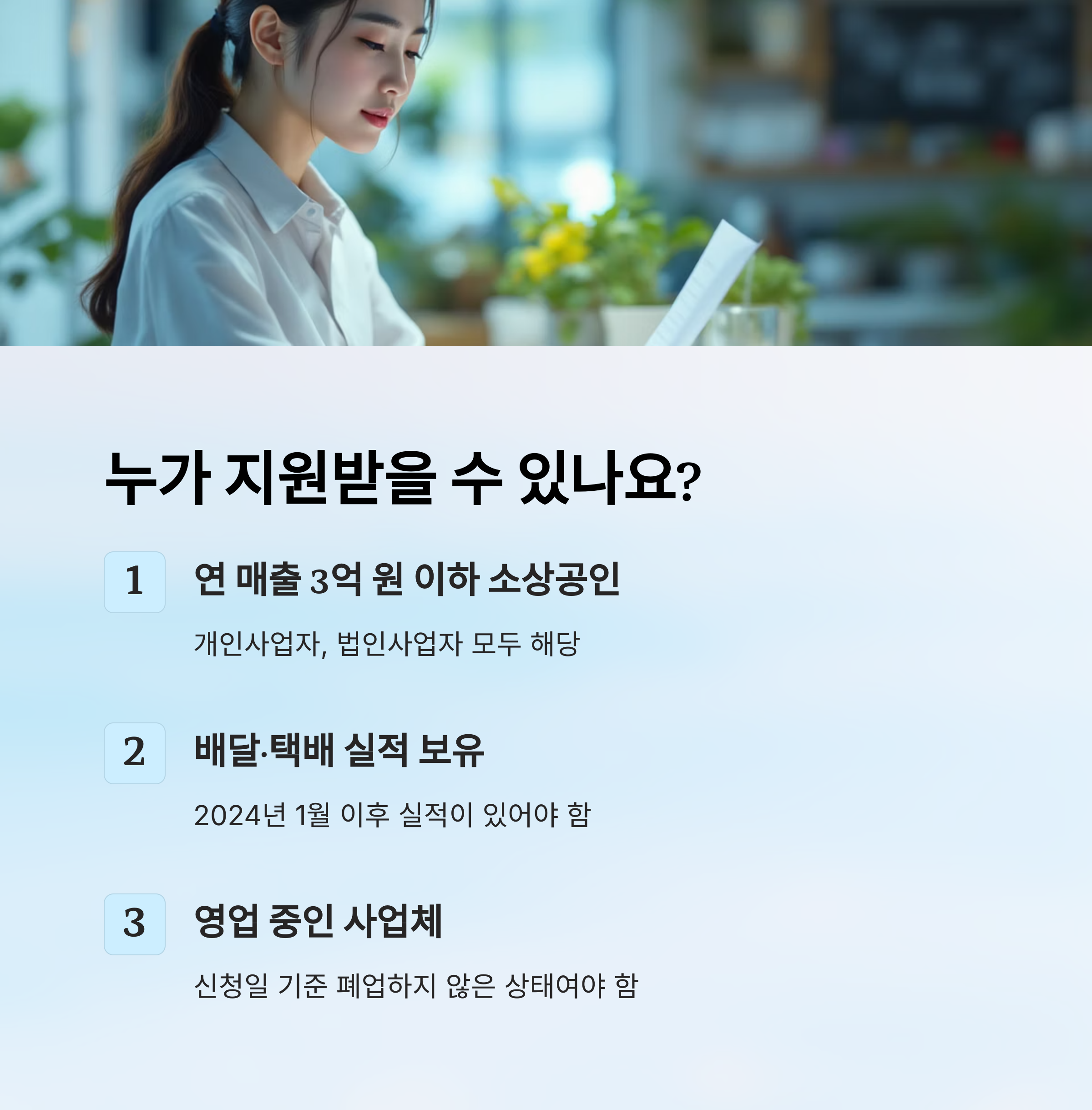 배달·택배비 지원사업은 연 매출 3억 원 이하의 소상공인을 대상으로 해요. 개인사업자, 법인사업자 모두 해당되며, 실제 배달·택배 실적이 2024년 1월 이후 존재해야 해요.