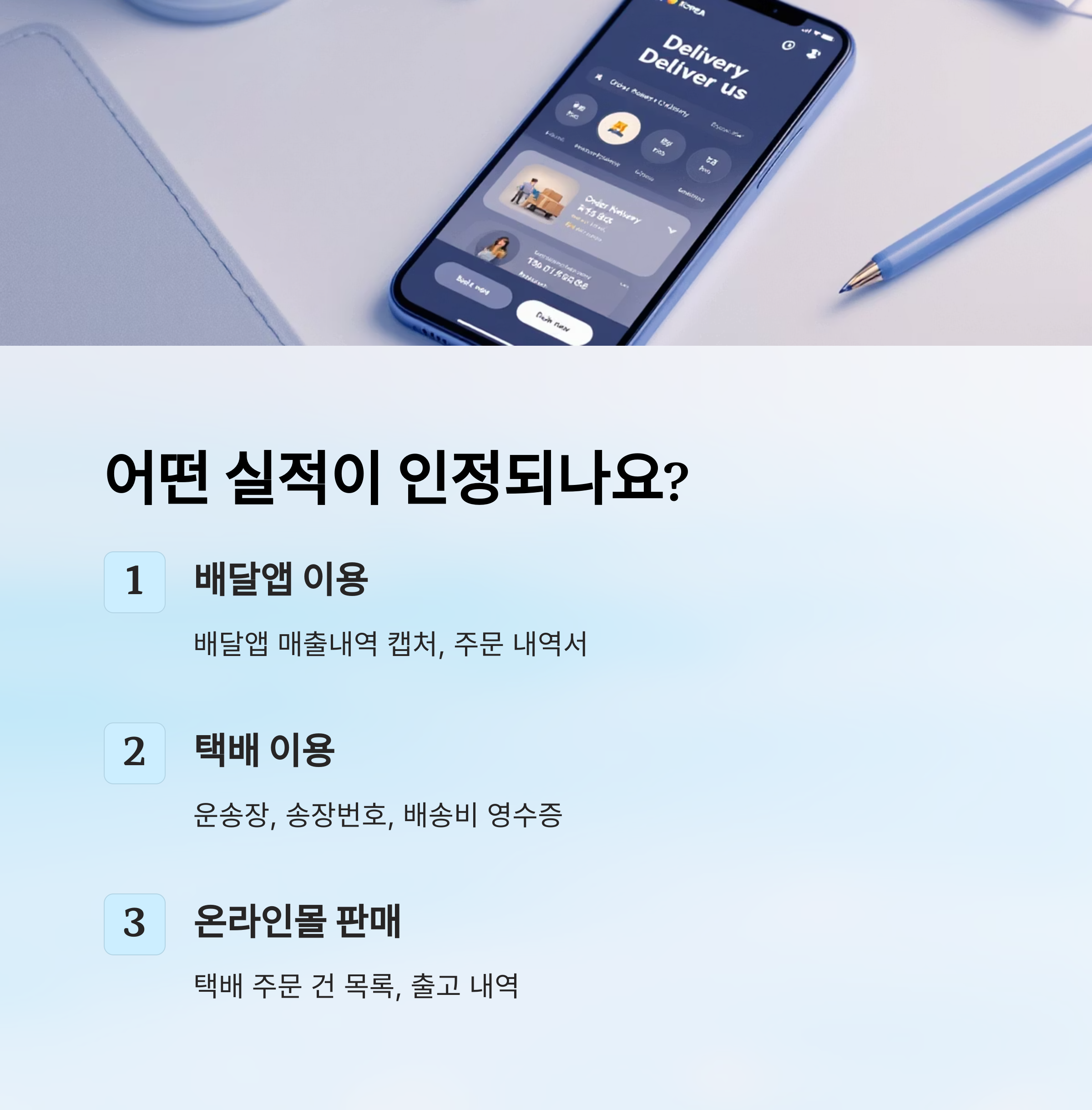 ※ 배달 앱 또는 택배 송장, 운송장, 영수증 등도 실적 증빙으로 활용될 수 있어요.