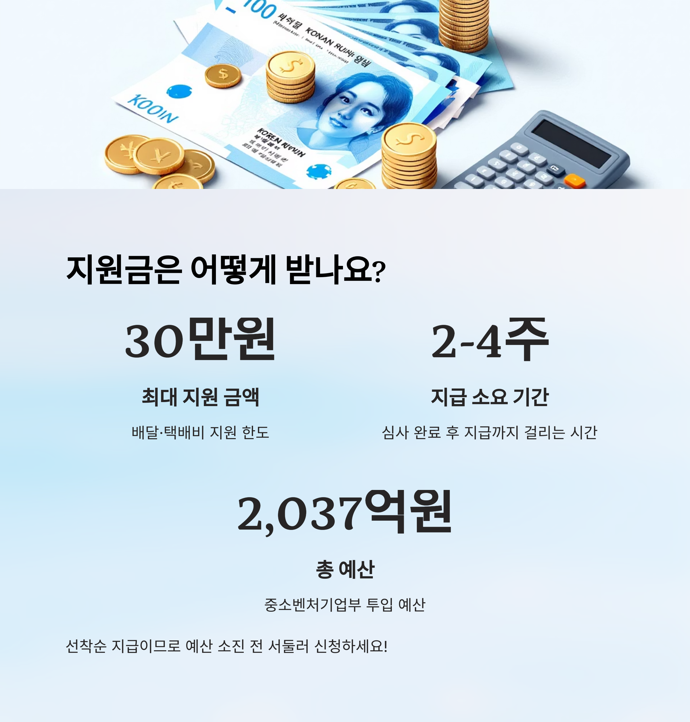 배달·택배비 지원은 최대 30만 원 한도로, 선착순 지급돼요. 즉, 조건이 맞아도 예산이 소진되면 지급이 불가능하다는 뜻이에요.