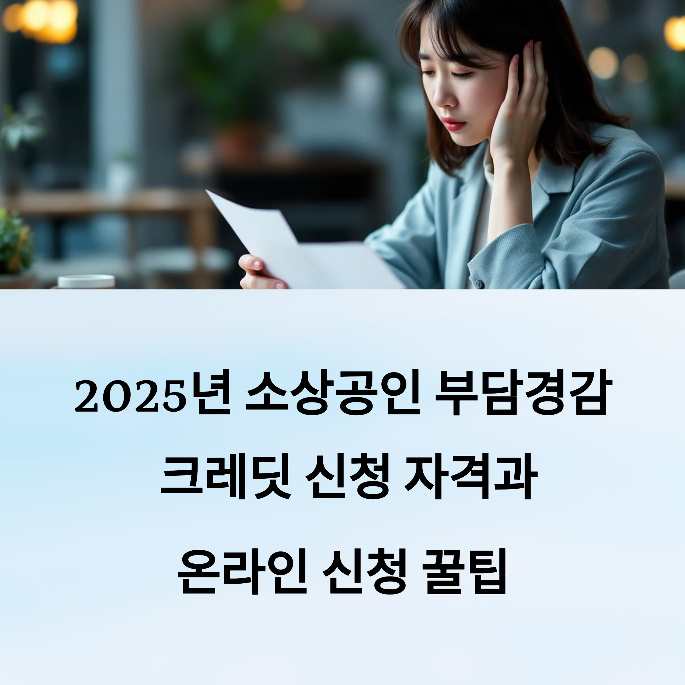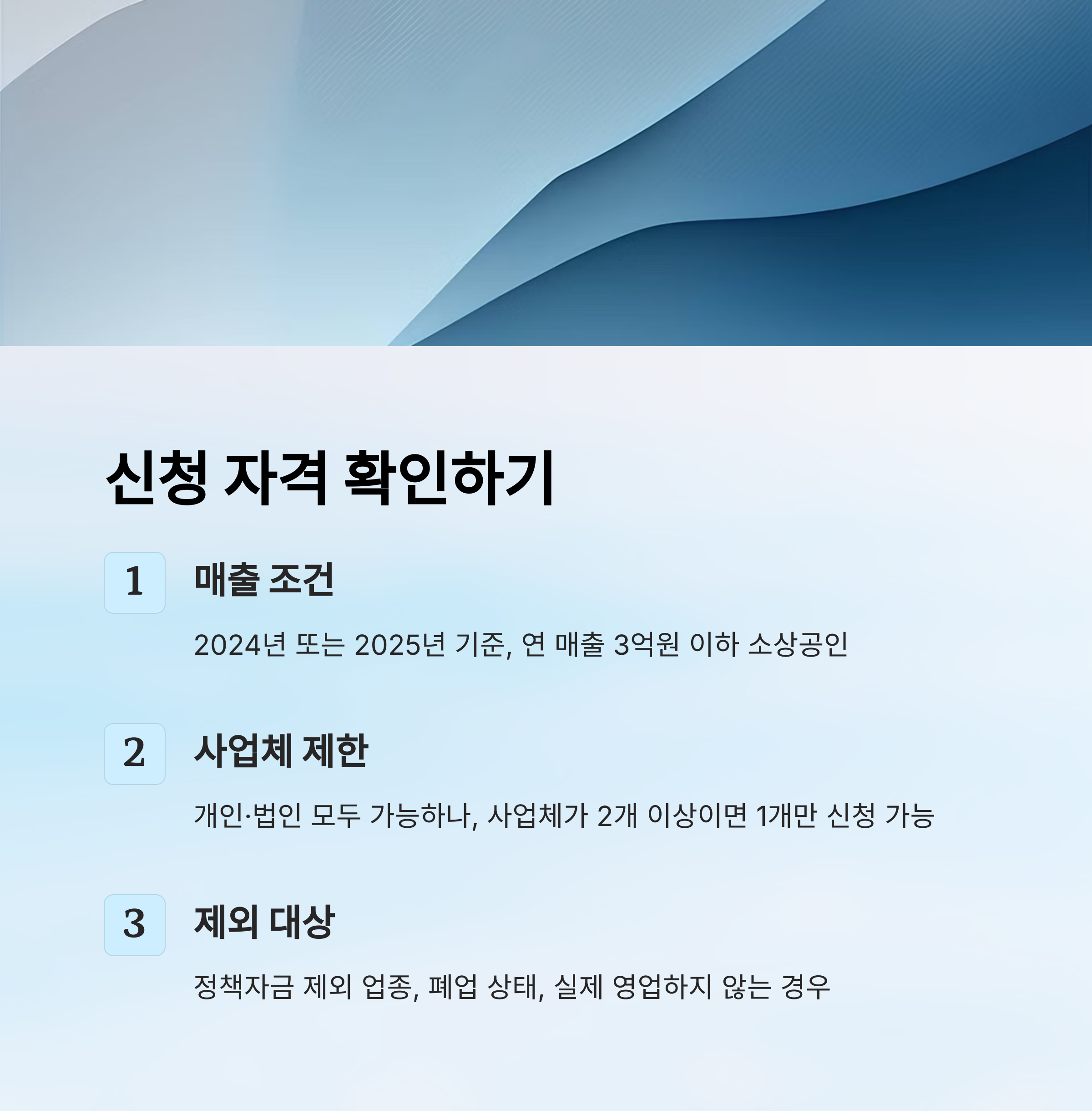 가장 먼저 체크해야 할 건 자격 조건이에요. 부담경감 크레딧은 2024년 또는 2025년 기준, 연 매출 3억원 이하의 소상공인을 대상으로 해요. 개인사업자, 법인사업자 모두 신청할 수 있지만, 사업체가 2개 이상이면 1개만 신청 가능해요.