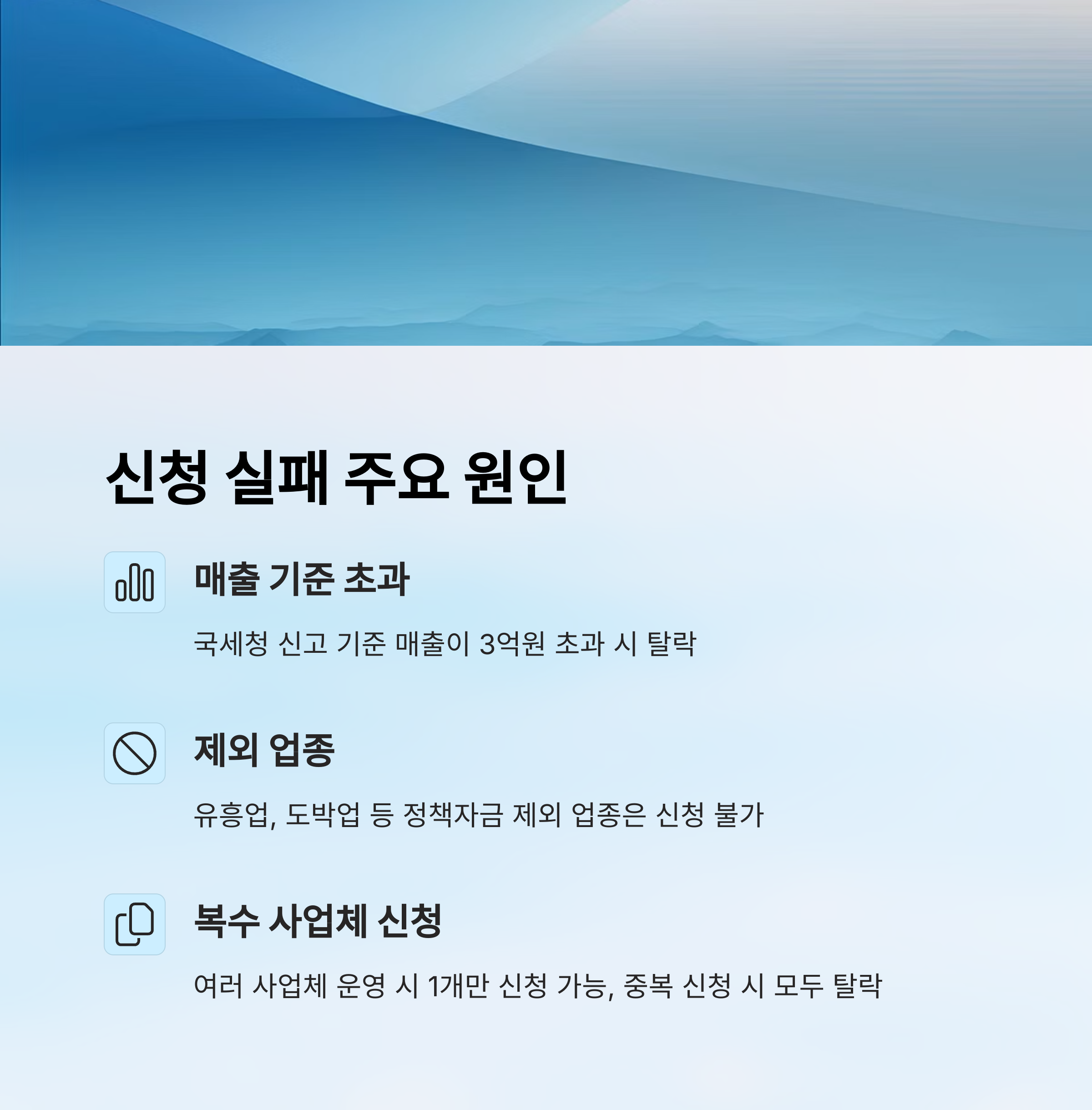 ❌ 매출 기준 초과: 국세청 신고 기준으로 매출이 3억 1천만 원이라도 초과된 거예요. 제출한 매출자료가 아니라 국세청 DB가 기준이에요.