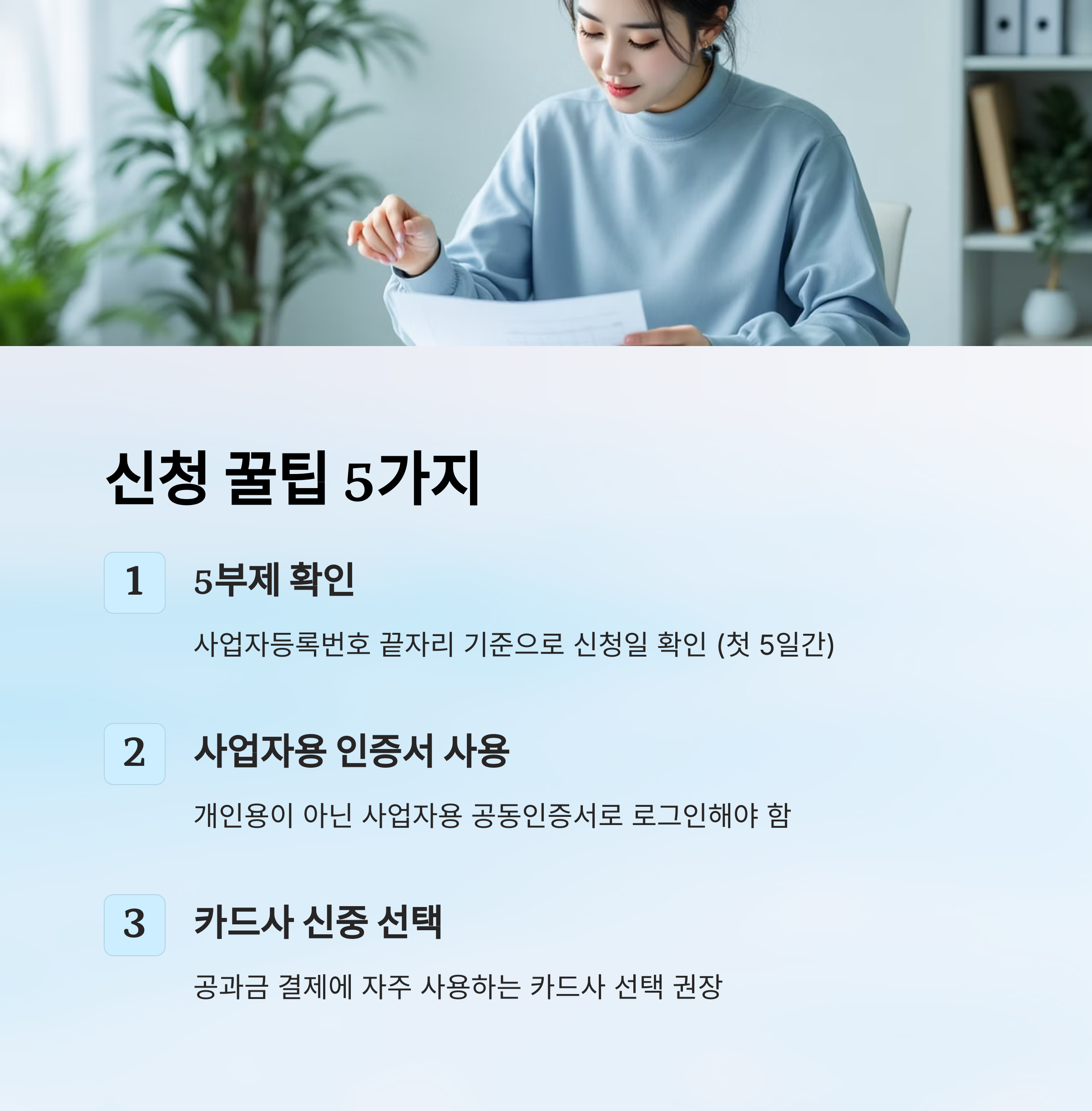 ① 신청 첫 5일은 5부제 운영: 사업자등록번호 끝자리를 확인하고 해당 요일에 신청해야 해요. 예를 들어 끝자리가 3이면 셋째 날에만 신청 가능해요.