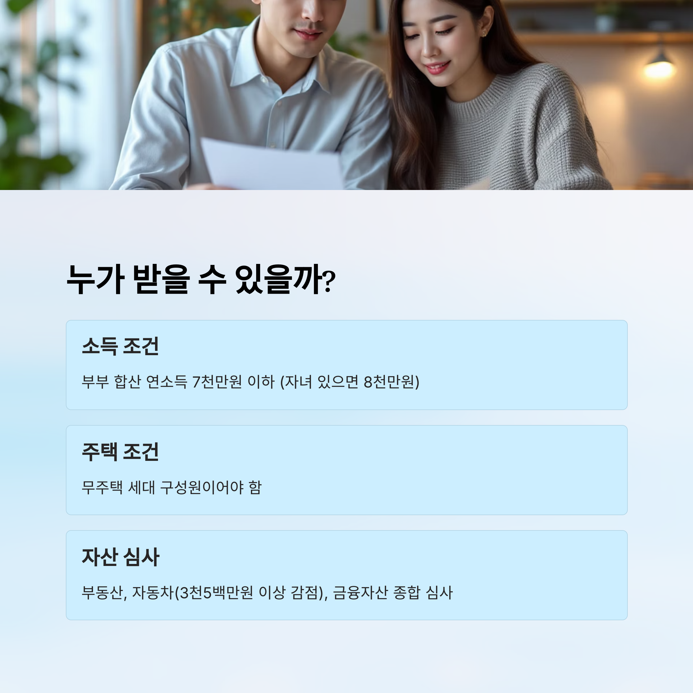 A2. 부부 합산 소득이 7천만 원을 넘는 경우 신청이 제한돼요. 자녀가 있다면 최대 8천만 원까지 허용돼요.