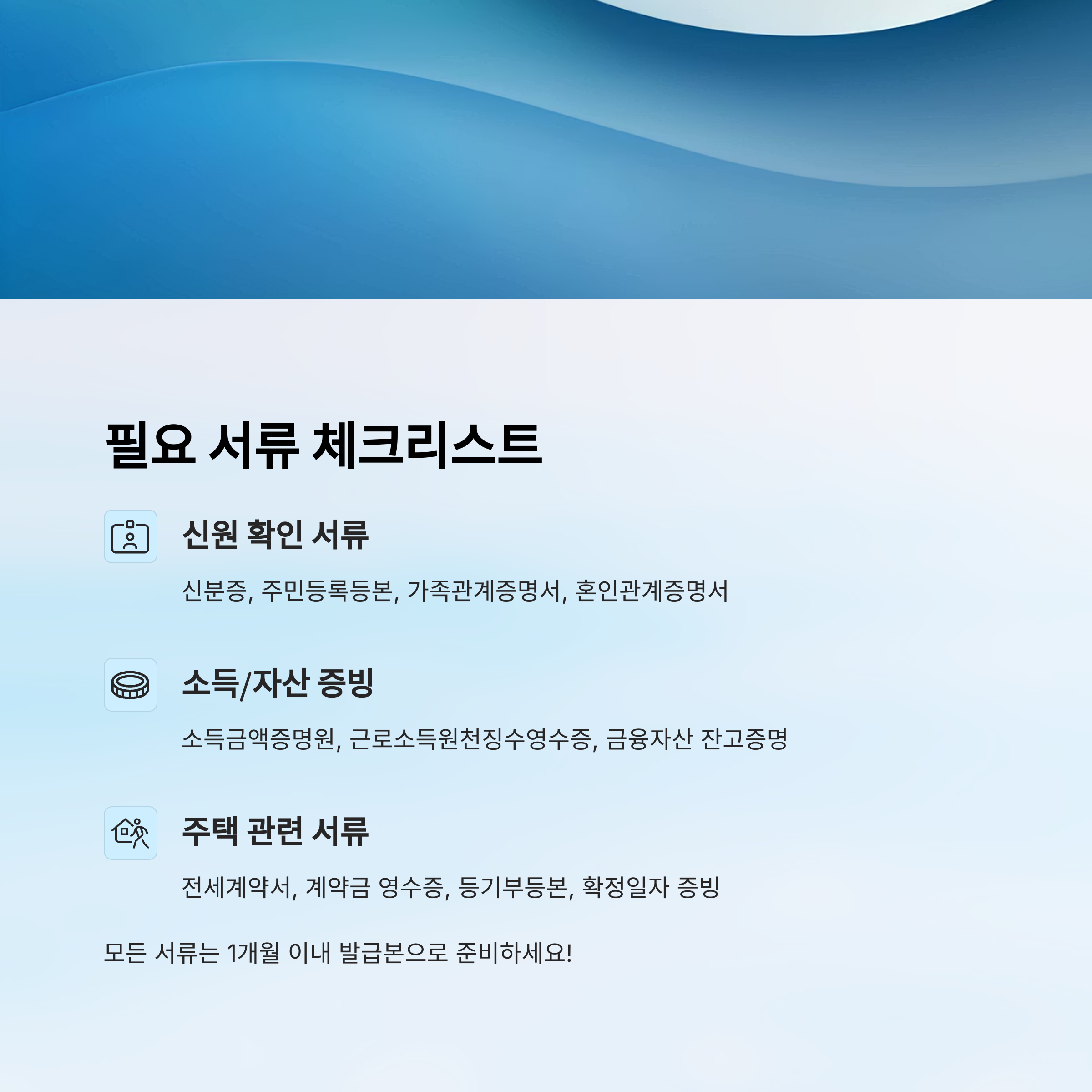모든 서류는 최근 1개월 이내 발급본으로 준비해야 하며, 온라인 발급이 가능한 문서는 정부24를 이용하면 편리해요. 📑