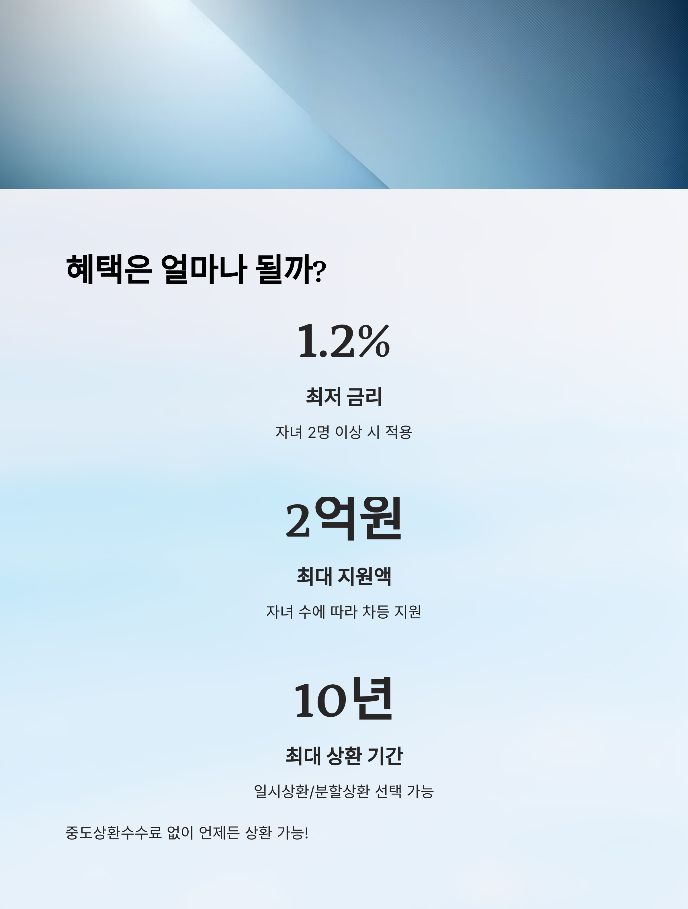 | 자녀 1명 | 1억 8천만 원 | 1.7% | 연소득 7천만 원 이하 | 일시/분할 선택 |