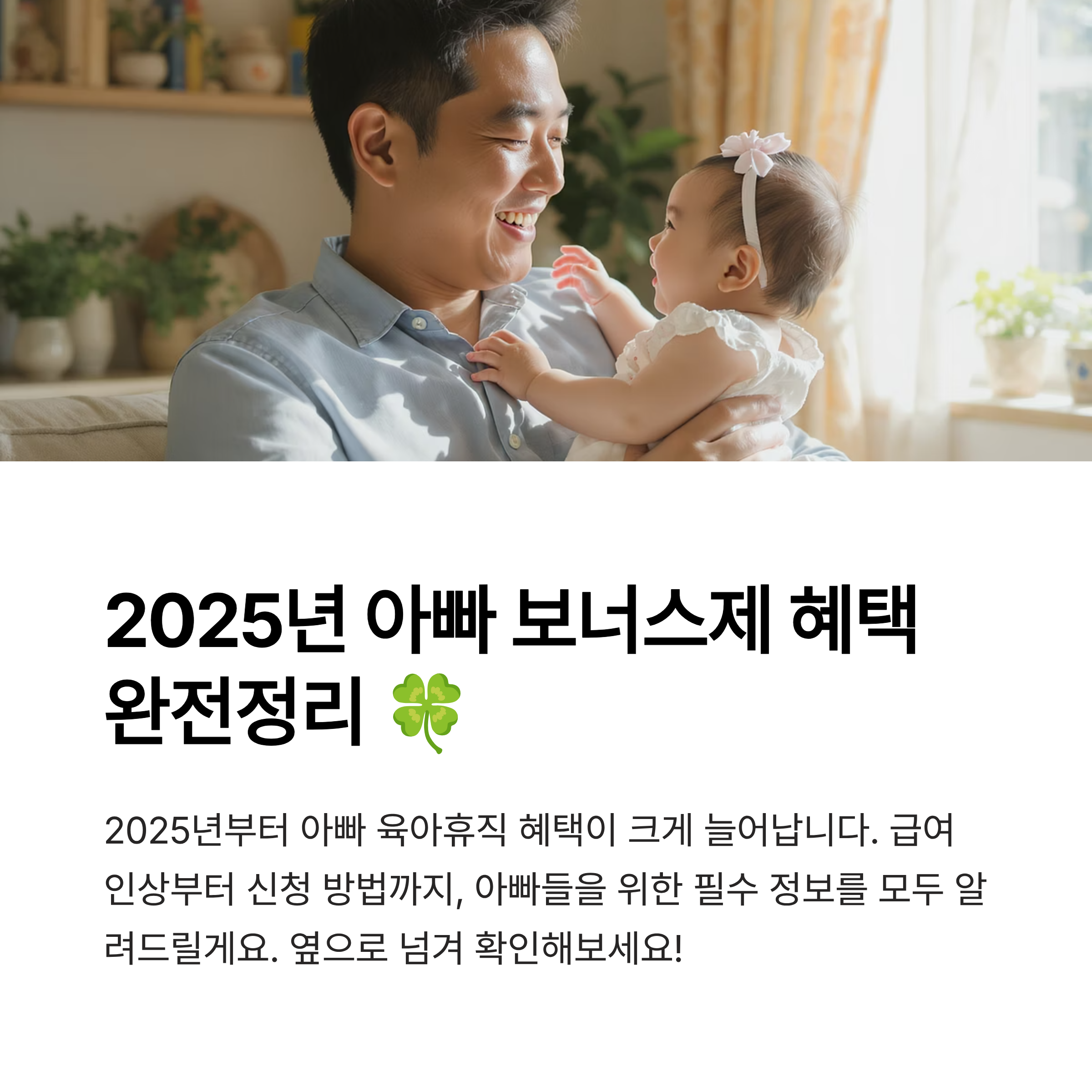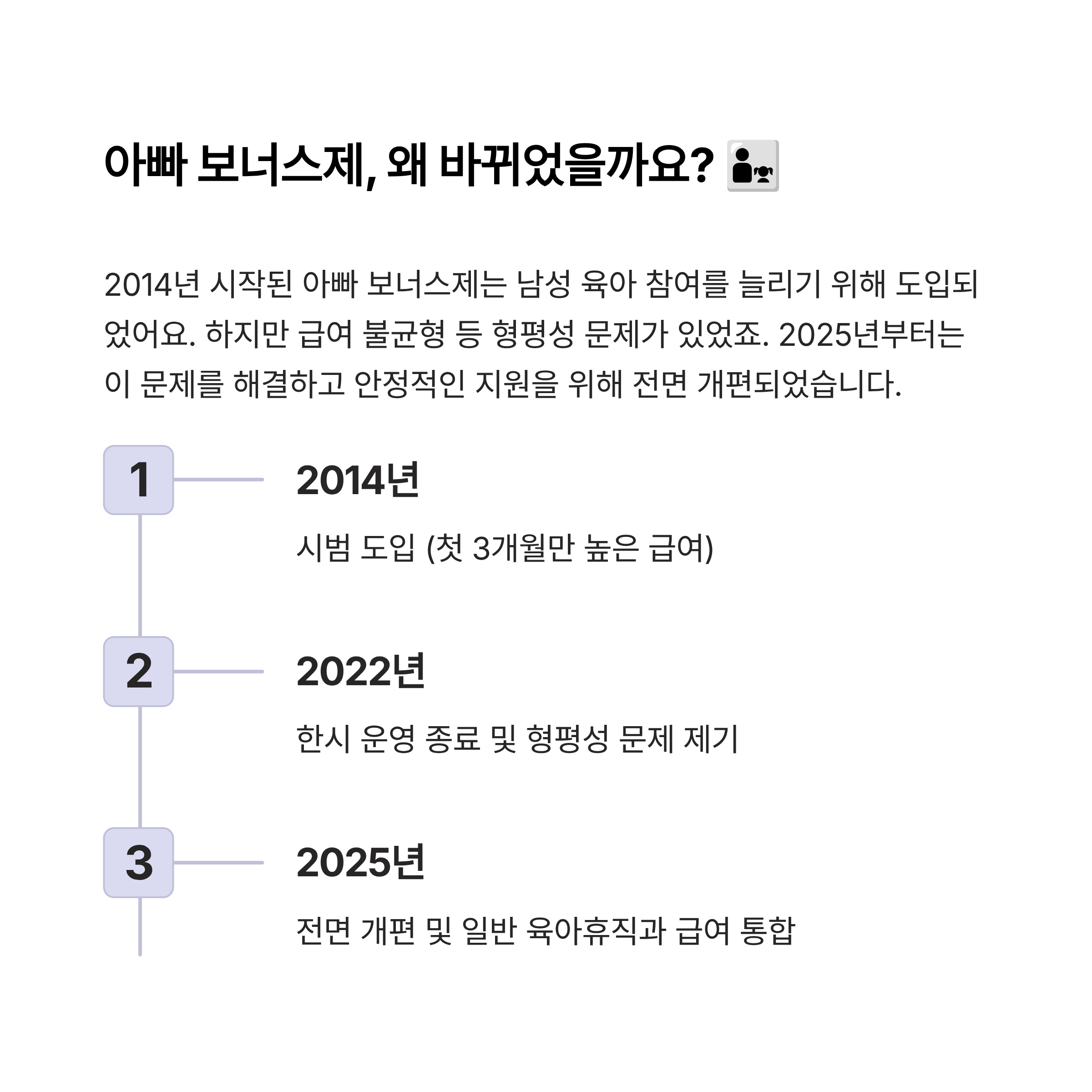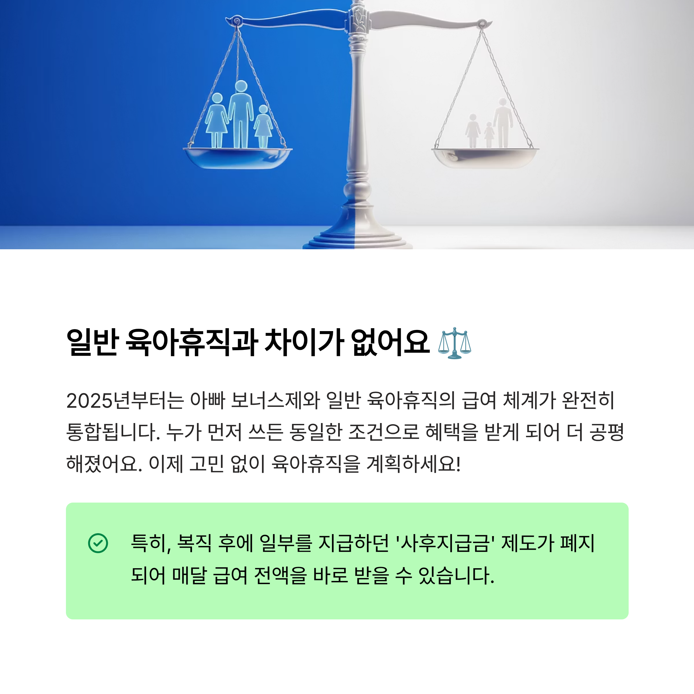 그래서 2025년부터는 '아빠 보너스제'를 더 이상 한시적 제도가 아니라, 일반 육아휴직급여와 동일한 급여를 받도록 개편해서 안정적으로 운영하게 된 거예요. 이렇게 되면 누구나 형평성 있게 육아휴직을 사용할 수 있고, 가정 내 성 역할 균형도 자연스럽게 맞춰지게 되는 거죠.