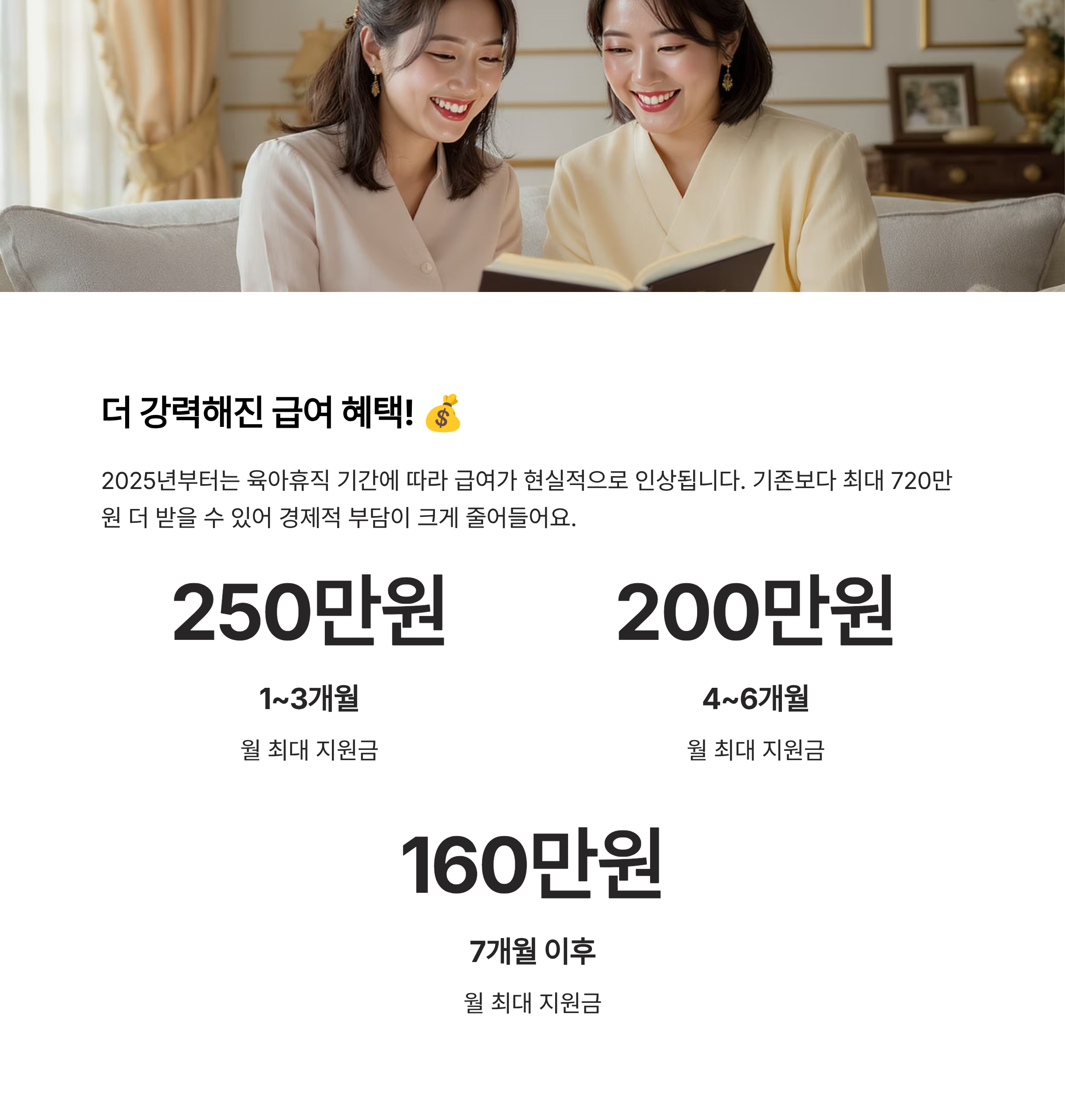 특히 인상된 급여는 2025년 1월 1일 이후 육아휴직 기간부터 소급 적용되기 때문에, 예전에 일부 육아휴직을 사용했던 사람들도 남은 기간에 더 많은 급여를 받을 수 있다는 점이 큰 혜택이에요.