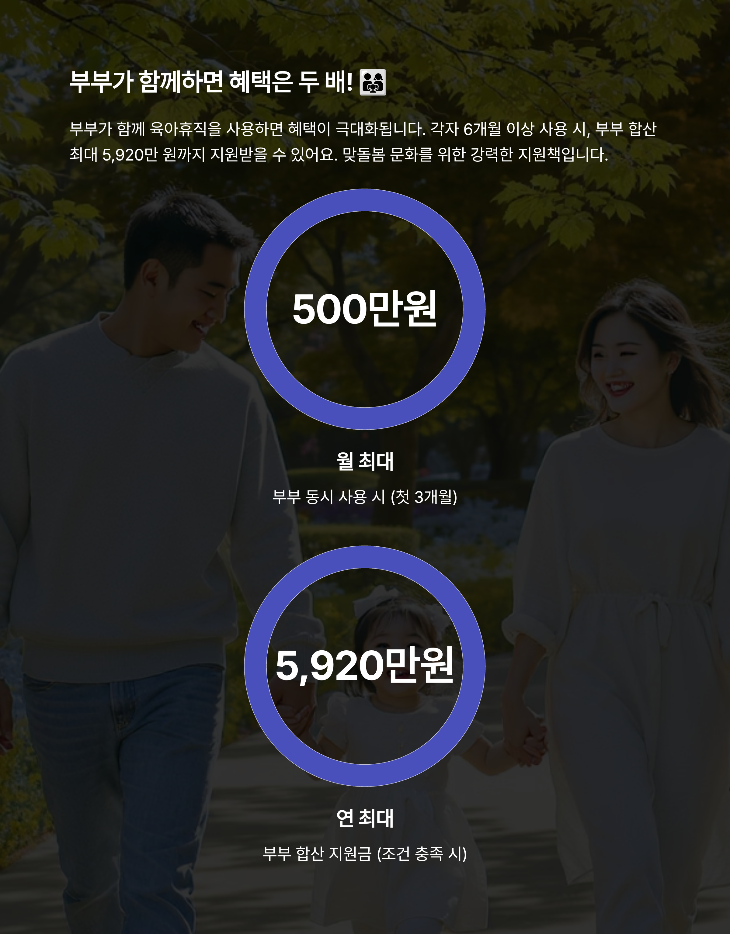 2025년부터는 부부가 함께 육아휴직을 사용하면, 각각 최대 2,960만 원, 부부 합산으로는 최대 5,920만 원까지 지원받을 수 있어요. 단, 각자가 6개월 이상 육아휴직을 사용하는 조건을 충족해야 해요.