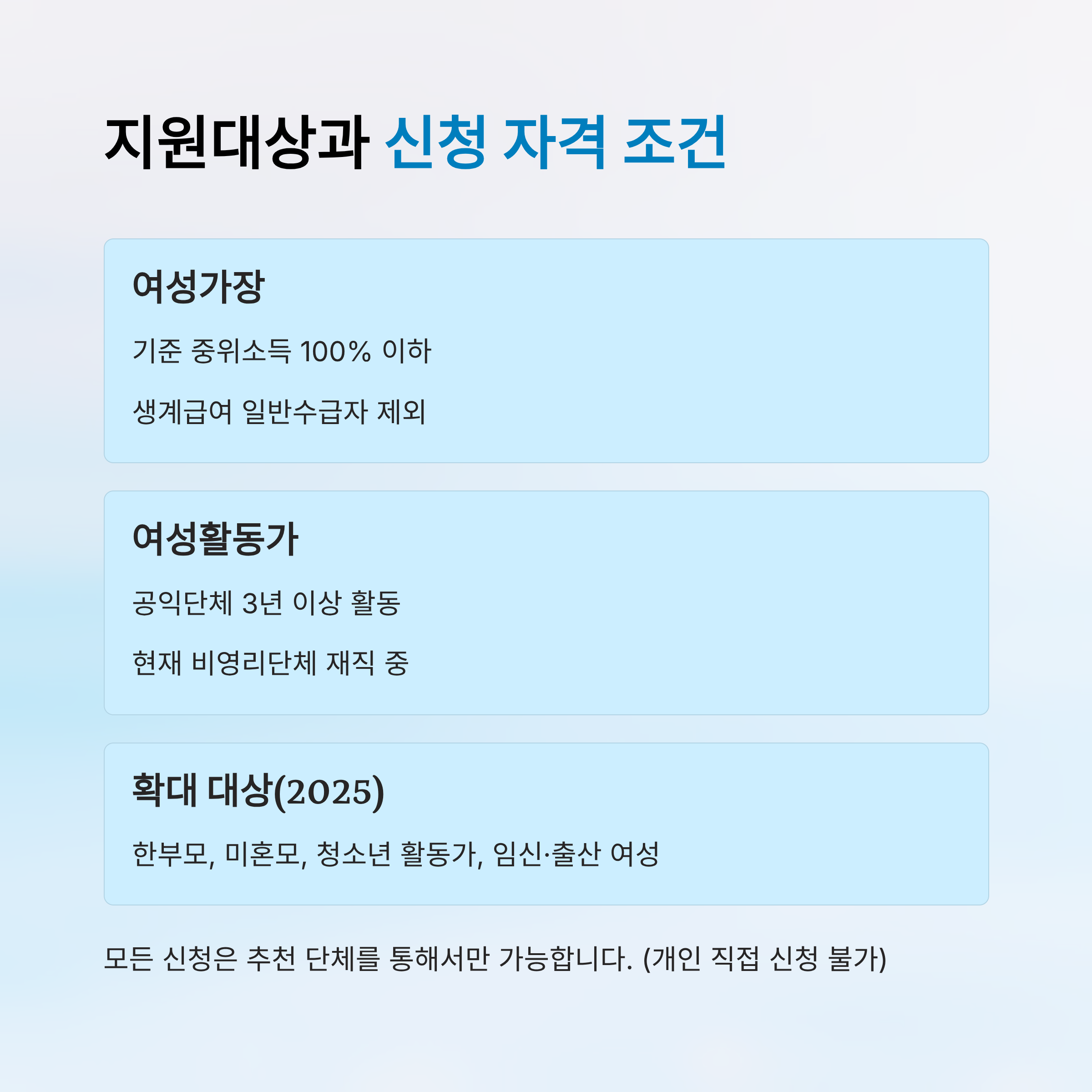 여성가장(기준 중위소득 100% 이하)과 공익단체에서 3년 이상 활동한 여성활동가가 기본 대상입니다. 2025년부터는 한부모, 미혼모, 청소년 활동가, 임신·출산 여성까지 범위가 확대되었습니다.