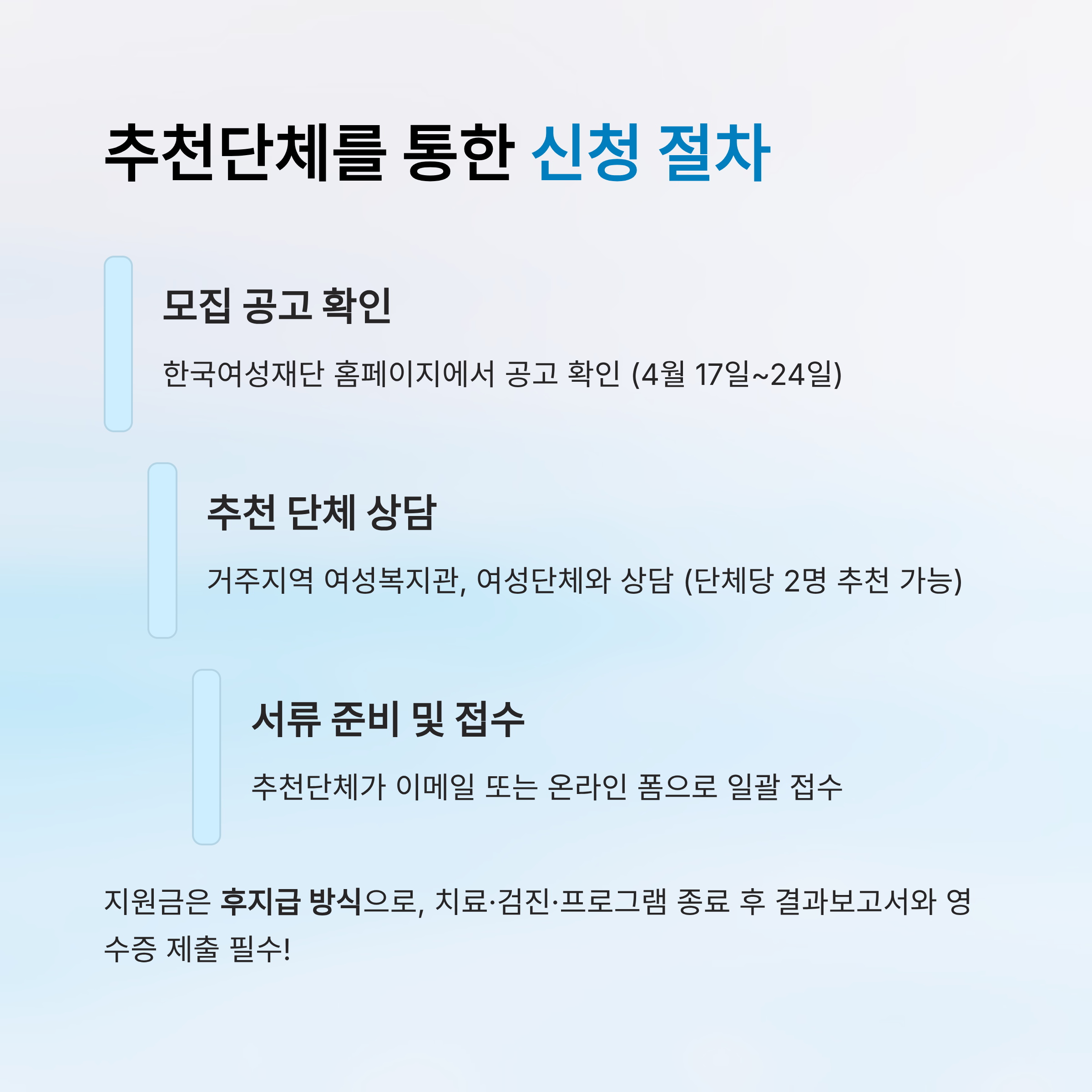 개인 신청은 불가능하며, 반드시 추천 단체(여성복지관, 여성단체 등)를 통해 신청해야 합니다. 추천 단체가 이메일이나 온라인 폼을 통해 일괄 접수합니다.